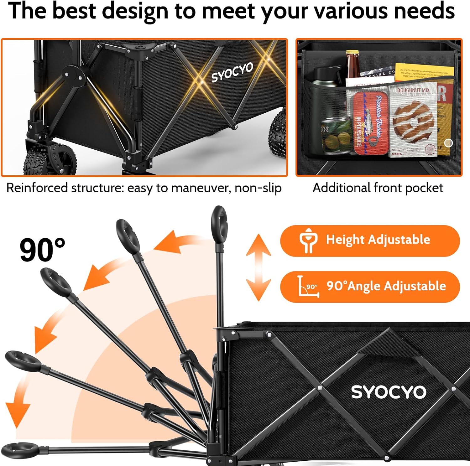 - Adjustable Handle: SYOCYO wagon really did it! Our folding wagon has smoothly rotating, 90°adjustable handle for making the beach wagon super easy to pull, turn and maneuver, Suitable for people of different body types. The handle locks securely in place, which can effectively control the direction of the folding wagon. Flexible handle could achieve the rebound function and keep it upright. You don't have to bend over to reach the handle