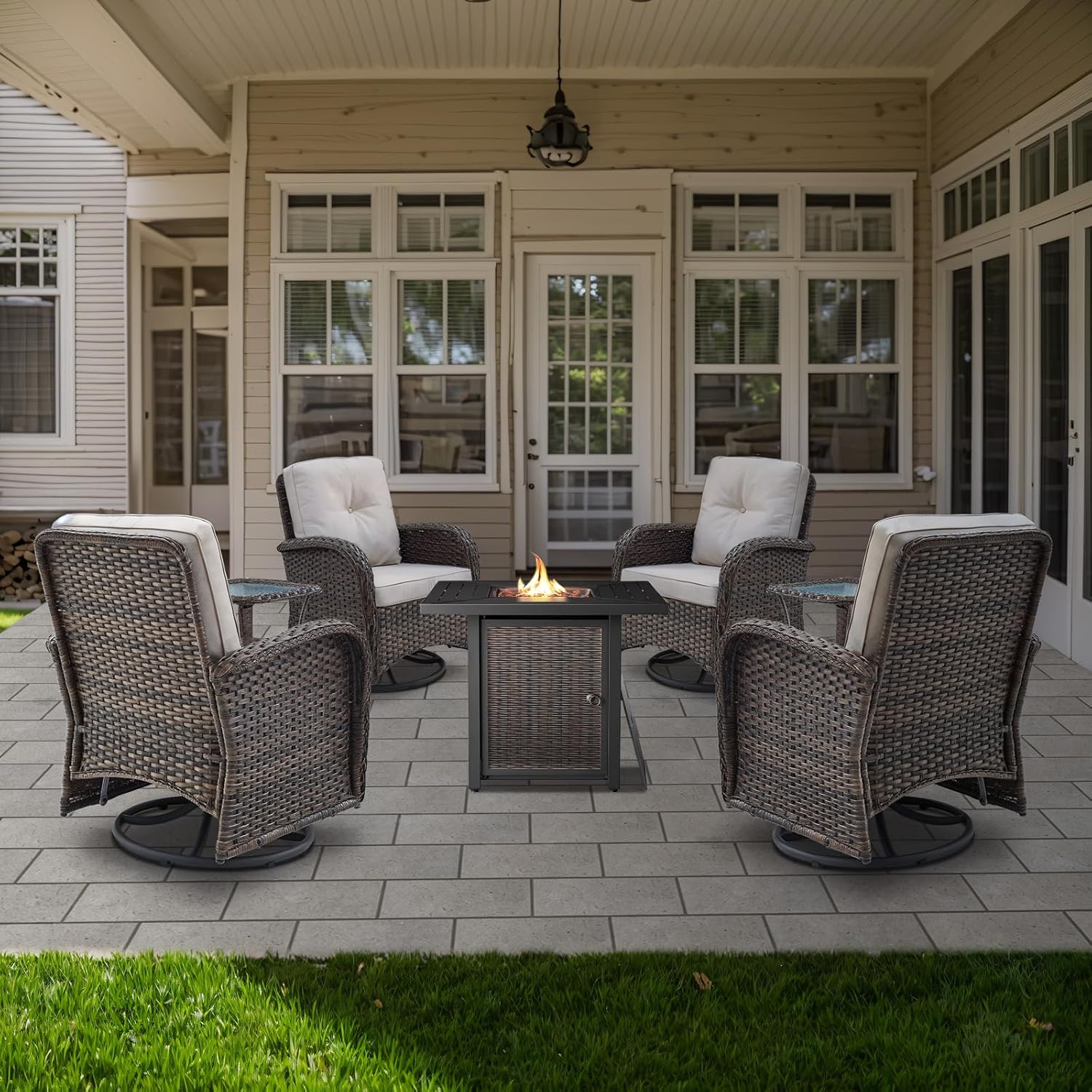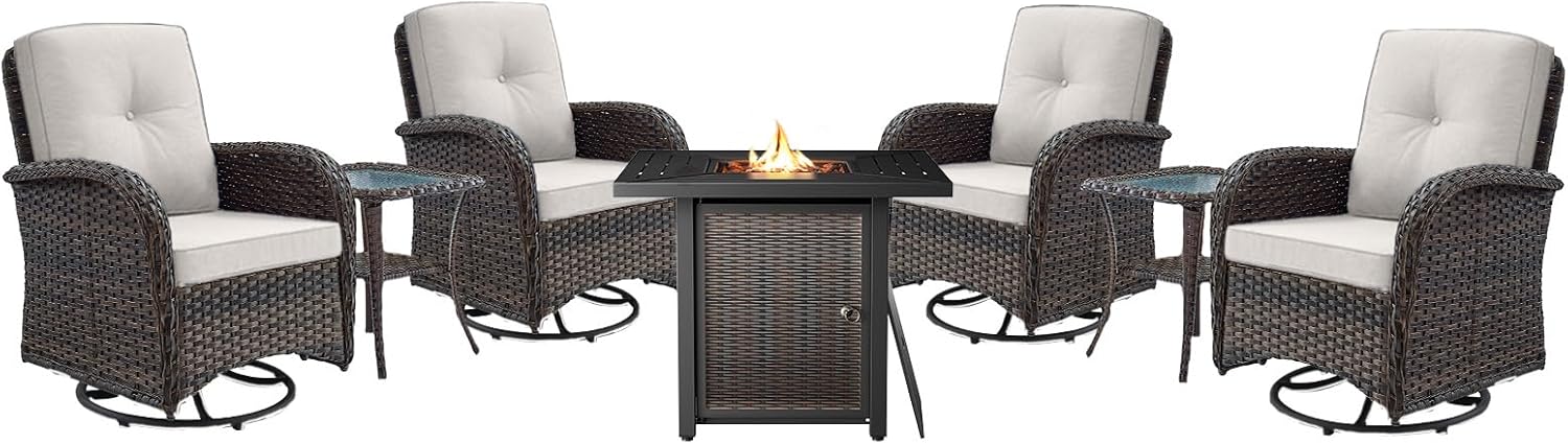 - Ultimate Outdoor Patio Comfort: This 7-piece outdoor patio furniture set, featuring 4 swivel rocker chairs, 2 side tables, and a 30-inch 50,000 BTU propane fire pit table, brings the ultimate comfort and style to your patio. Perfect for any outdoor setting, this outdoor patio conversation set elevates your outdoor experience, creating a cozy spot for relaxation and socializing.