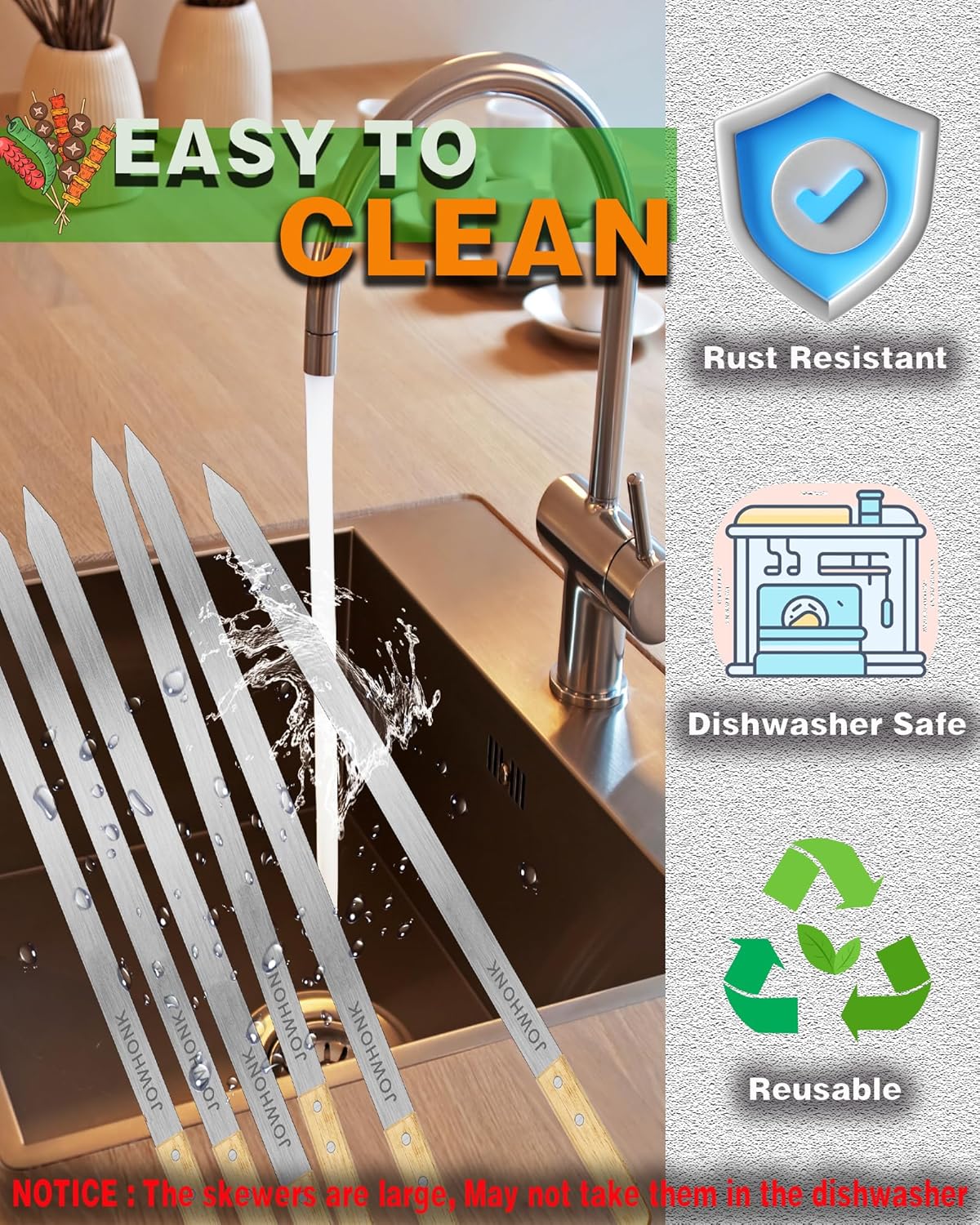 - 【FOOD GRADE 304 STAINLESS STEEL】JOWHONK heavy-duty skewers for grilling are 27 inch long,1 inch wide,0.07 in thickness. Our wooden handle flat metal skewers for kabobs are made of premium 304 stainless steel, Ensuring non-rust long time durability, Heat resistant and non-poisonous,Harder than other stainless steel and iron. It's safety for children.Our 304 stainless steel barbecue skewers are reusable. The BBQ kabob skewers surface is smooth that grilled food residue won't get stuck onto the kabob skewer blade.