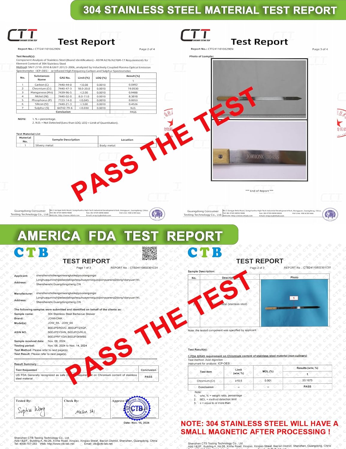 - 【304 STAINLESS STEEL HAS WEAK MAGNETISM】304 stainless steel may have weak magnetism because during the processing and forging process of the product, a small amount of austenite is converted into martensite, so 304 stainless steel may have a little magnetism,which is a normal phenomenon. We have America F..D..A test report and 304 stainless steel material test report, you can buy and use securely.