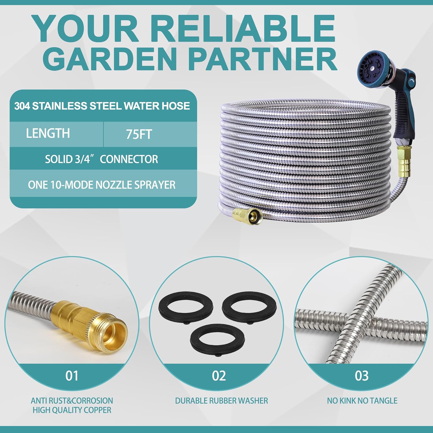 75FT 5/8'' Garden Hose, 304 Stainless Steel Water Hose, Flexible with a 10-Mode Nozzle Sprayer, No Kink, Lightweight, Puncture Proof Metal Hose, Ideal for Yard, Lawn, Outdoor