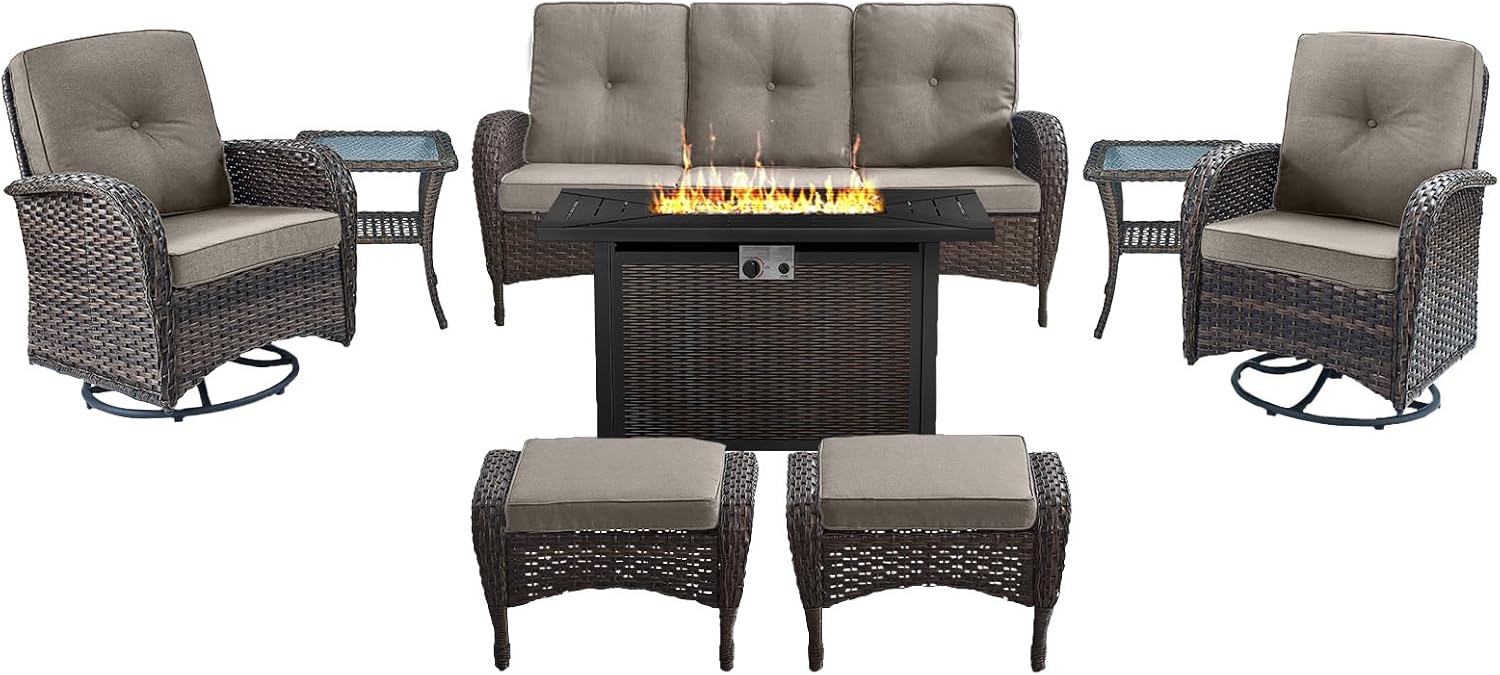 - Premium Outdoor Patio Furniture Set: This 8-piece patio conversation set includes 2 swivel rocker chairs, 2 ottomans, a comfortable sofa, 2 stylish side tables, and a 43-inch 50,000 BTU propane fire pit table, creating the perfect setup for relaxation and socializing. Ideal for outdoor spaces like backyards, poolside, decks, and patios.