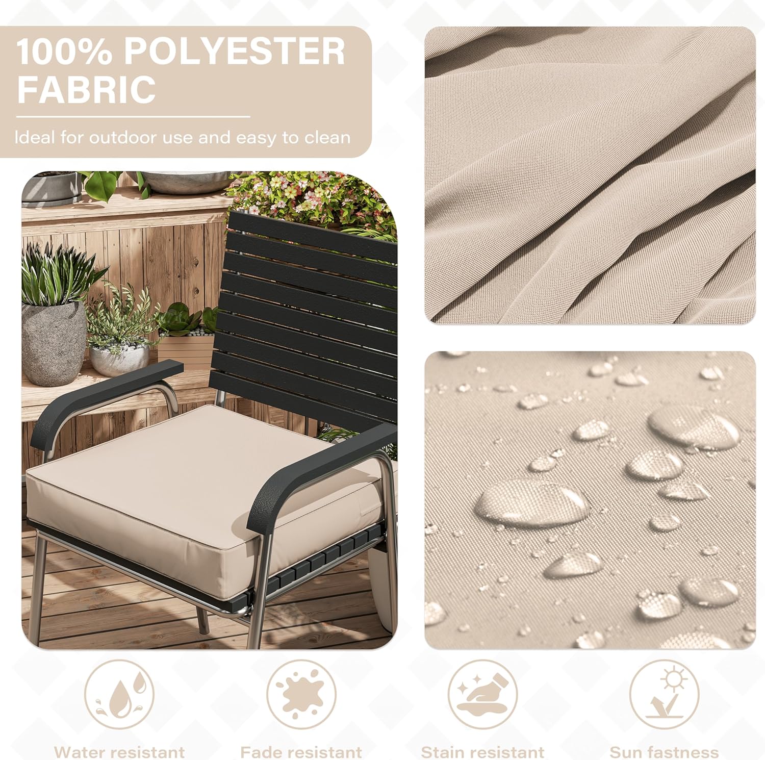 - 🎄 WEATHERPROOF - The Patio Furniture Chair Cushion is made of double-layer waterproof coated fabric that is waterproof on all sides, keeping the rain out and keeping the foam dry and tidy. Even in bad weather, it looks brand new with just a little care from you!