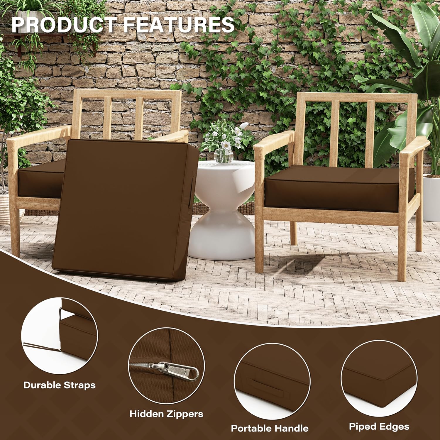 Patio Chair Cushions 24 X 24 X 5 Inch Waterproof Outdoor Seat Cushions for Patio Furniture, Outdoor Sofa Couch Pads with Ties & Handle, Set of 2, Chocolate