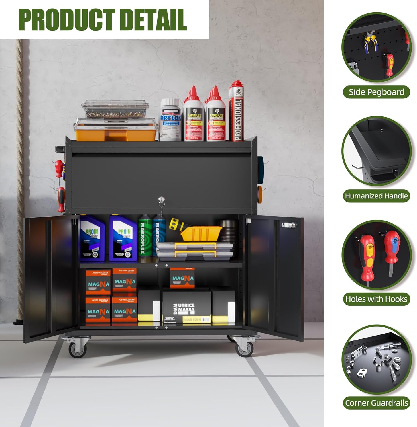 35.43'' H Metal Storage Cabinet on Wheels with 1 Drawer, Rolling Steel Garage Tools Cabinet with Side Pegboard &4 Hooks & 1 Adjustable Shelf for Garage,Shop,Home, Black, Assembly Required