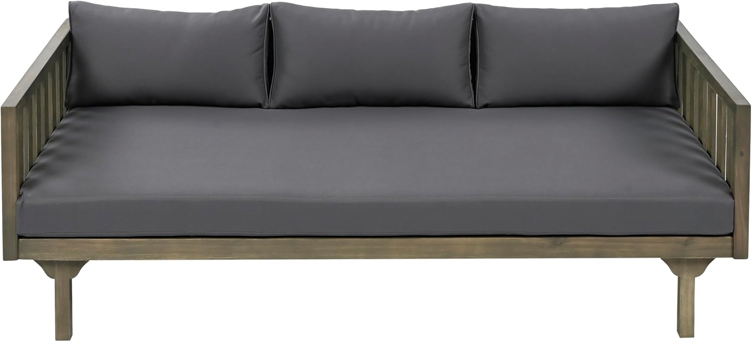 Christopher Knight Home Claremont Outdoor 3 Seater Acacia Wood Daybed with Fabric Water Resistant and Removable Cushions, Patio Garden Sofa with Slat Paneling Armrest and Back, Grey and Dark Grey