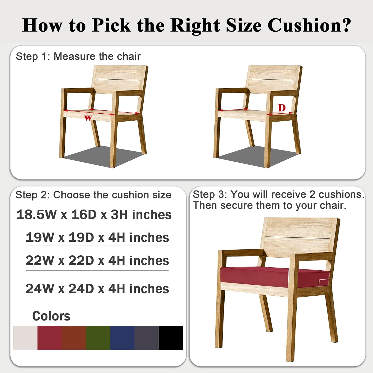 - PERFECT SIZE: Outdoor chair cushion set includes 2 cushions. Cushions measure: 24 inch (W) 24 inch (D) 4 inch (H). Fits most standard size outdoor chairs. Since the outdoor cushions are vacuum-packed, it may take 24-53 hours for the cushion foam to fluff back up after opening the vacuum bag