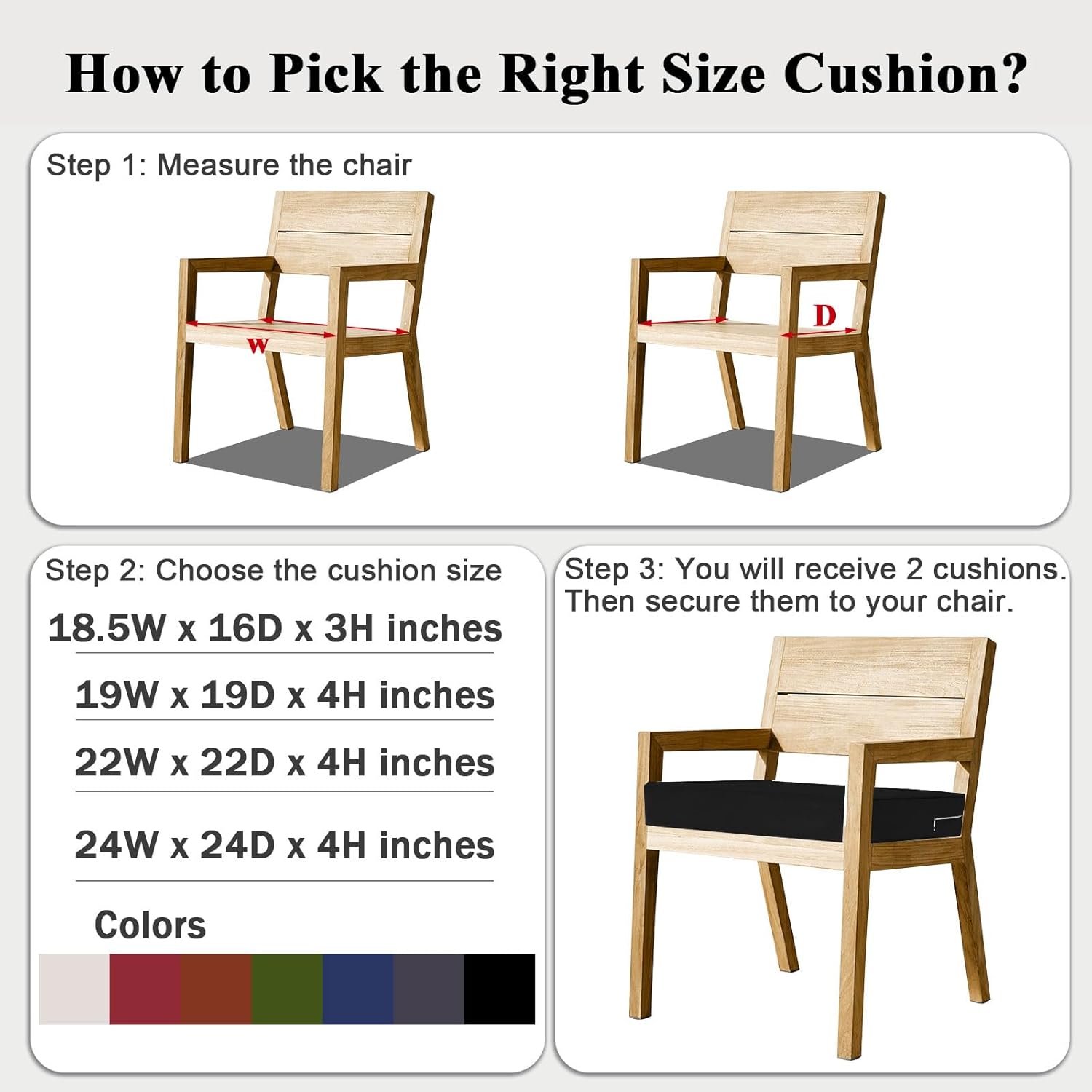 - PERFECT SIZE: Outdoor chair cushion set includes 2 cushions. Cushions measure: 19 inch (W) 19 inch (D) 4 inch (H). Fits most standard size outdoor chairs. Since the outdoor cushions are vacuum-packed, it may take 24-52 hours for the cushion foam to fluff back up after opening the vacuum bag