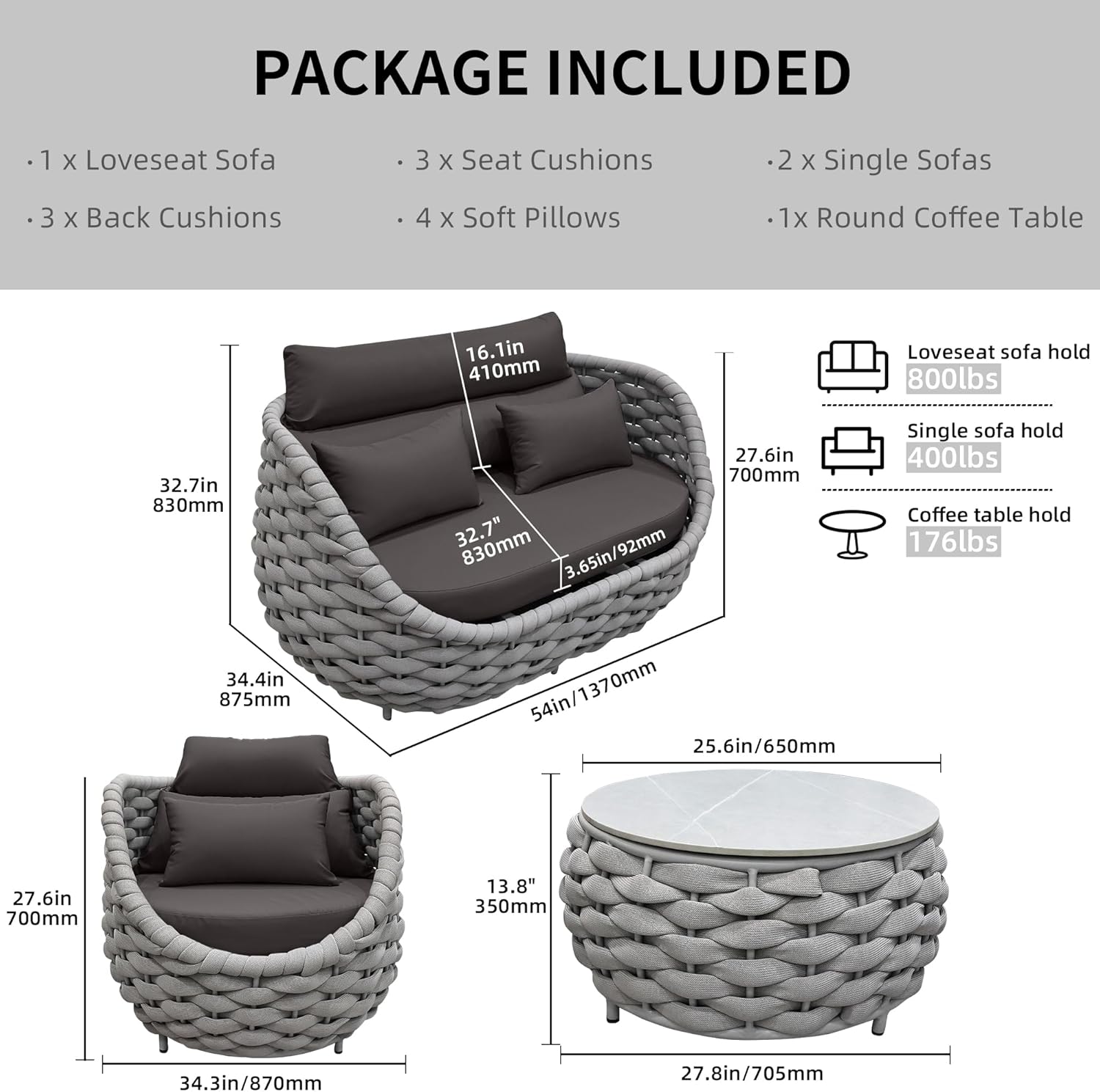 - Dimension,No Required Assembly - Loveseat Sofa: 54"(L) x 33"(W) x 27.6"(H);Single Chair: 34.3"(L) x 33"(W)x27.6 "(H);Round Table: 28"(W) x 13.8"(H).Outdoor sectional sofa can hold 400 lbs for each seating.Round coffee table can hold 176 lbs.Get your outdoor life refreshed with 4 piece aluminum patio furniture.