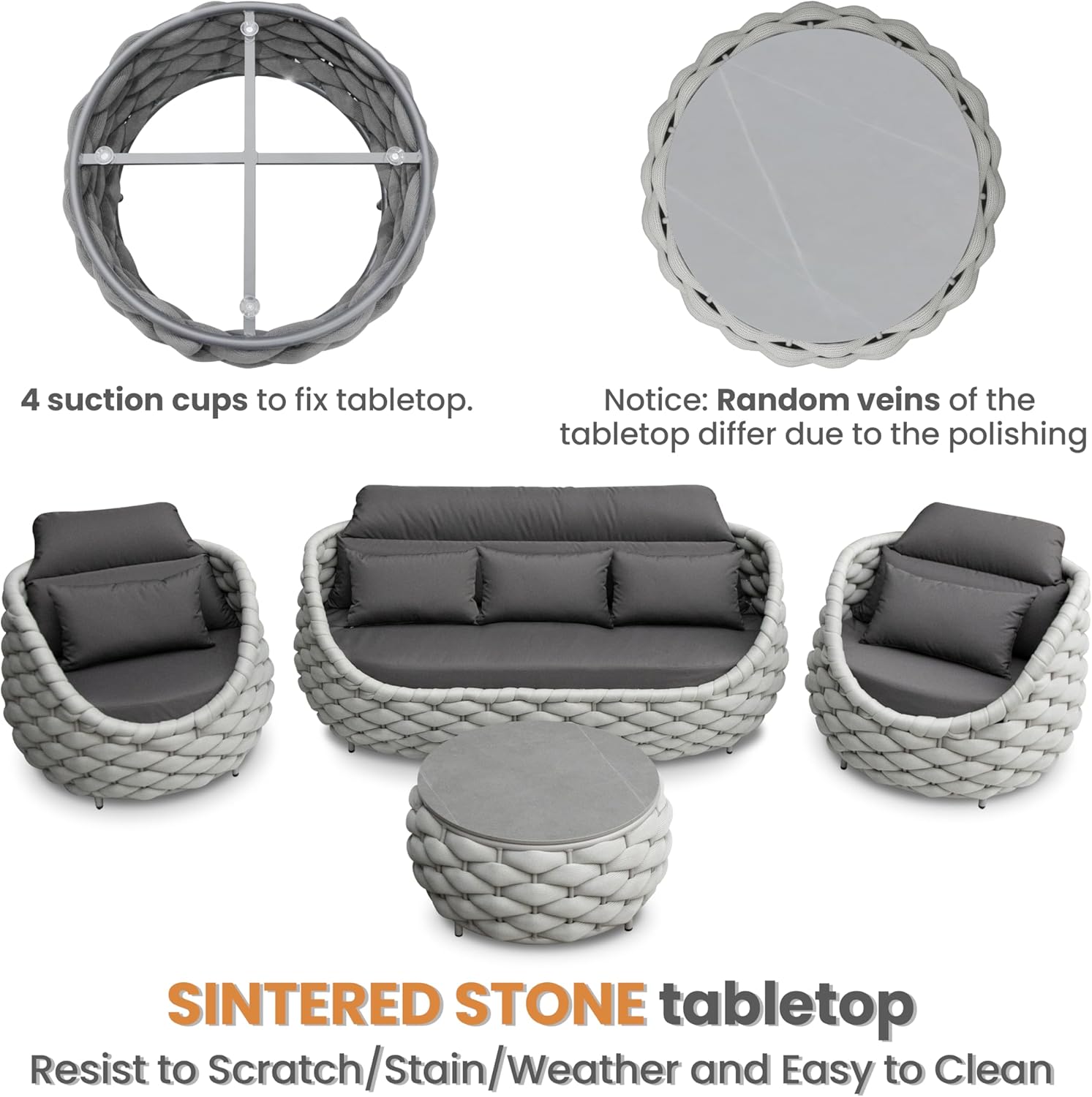 - Furniture set is crafted from reinforced rust-free aluminum alloy frame, wrapped in hand woven polyester rope. The 4 pieces all weather patio upholstered conversation set resists to UV, rain, wind, salt water. Perfect for indoor outdoor even arid or coastal areas