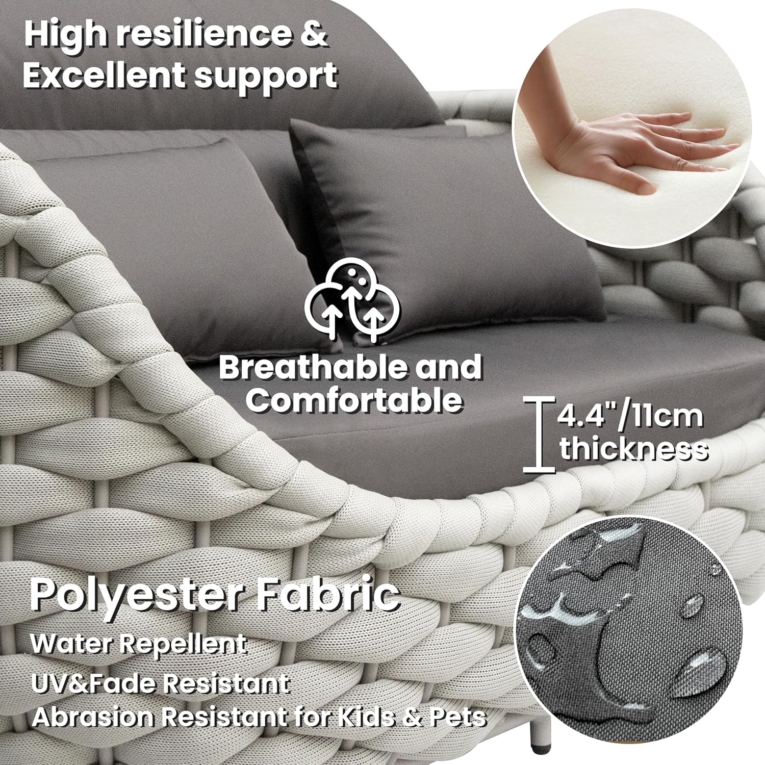 Rope Patio Furniture Set: 4 Pieces Aluminum Outdoor Couch Set Cushioned - Assembled Conversation Sofa Set Modern - Metal Porch Seating for 5 Person - All Weather for Deck Garden Poolside Hotel
