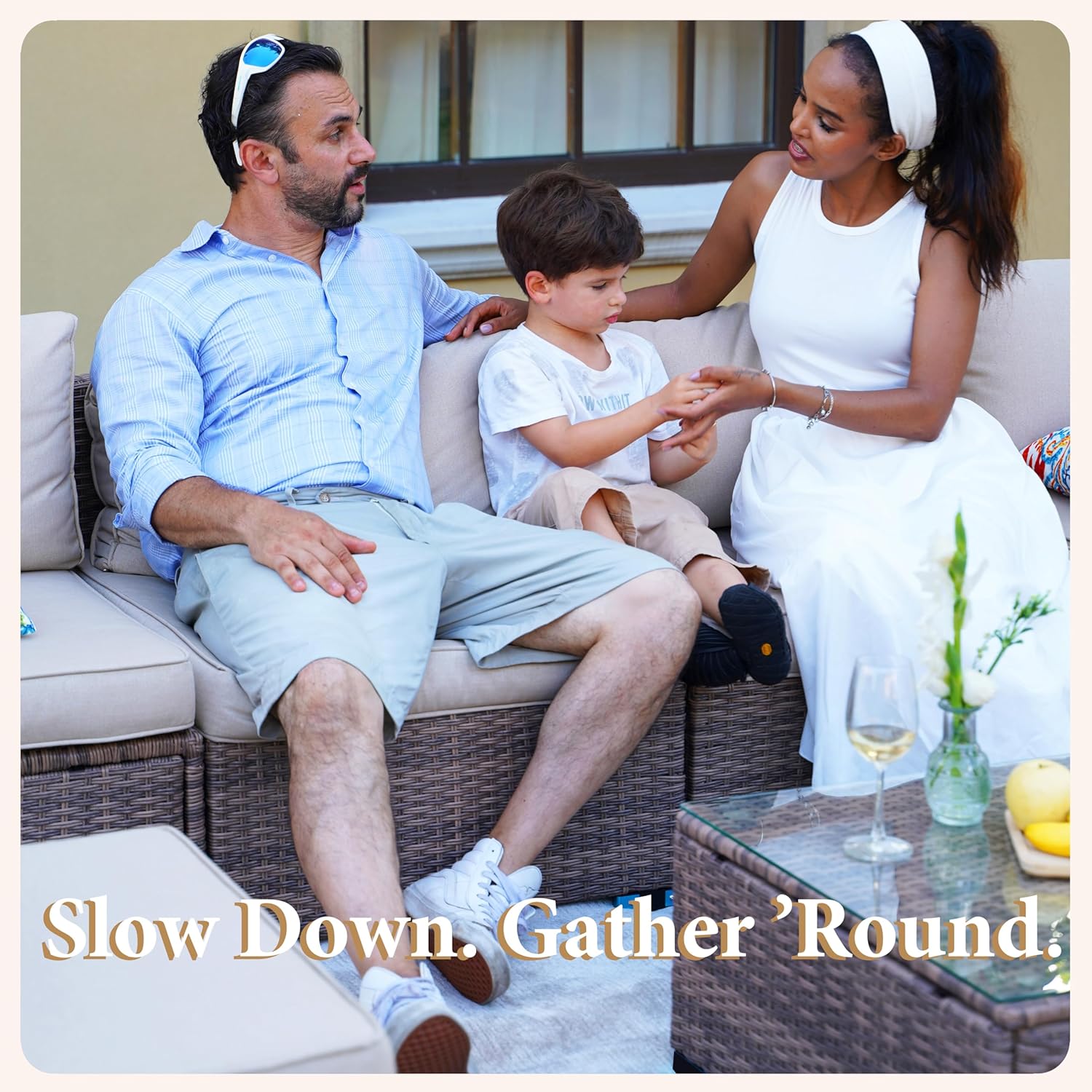 7 Pieces Patio Furniture Set - All-Weather Outdoor Wicker Sectional Conversation Sofa, Rattan Patio Seating Sofa Set with Cushion and Glass Table for Porch Poolside, Brown/Beige