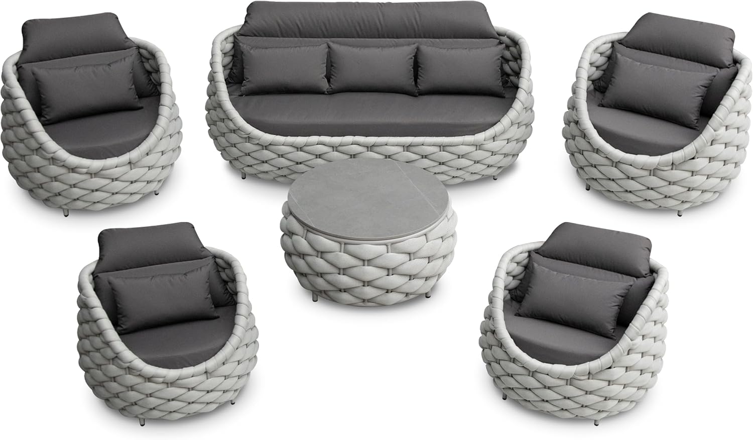 - Furniture set is crafted from reinforced rust-free aluminum alloy frame, wrapped in hand woven polyester rope. The 6 pieces all weather patio upholstered conversation set resists to UV, rain, wind, salt water. Perfect for indoor outdoor even arid or coastal areas