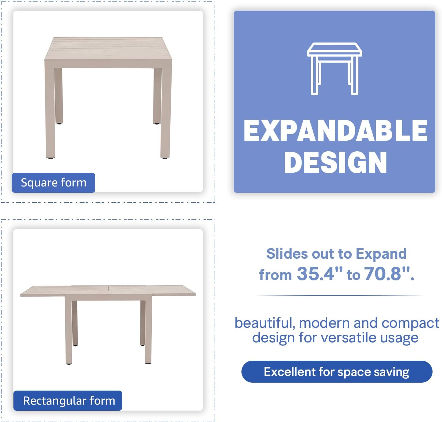 - 【WIDE APPLICATION】: With its extension design and quality aluminum, the extendable outdoor dining table conveniently expands to make it easy for you to add extra seats when needed. Perfect for hosting, either using the expandable table as your main dining table or as a serving table for larger events.
