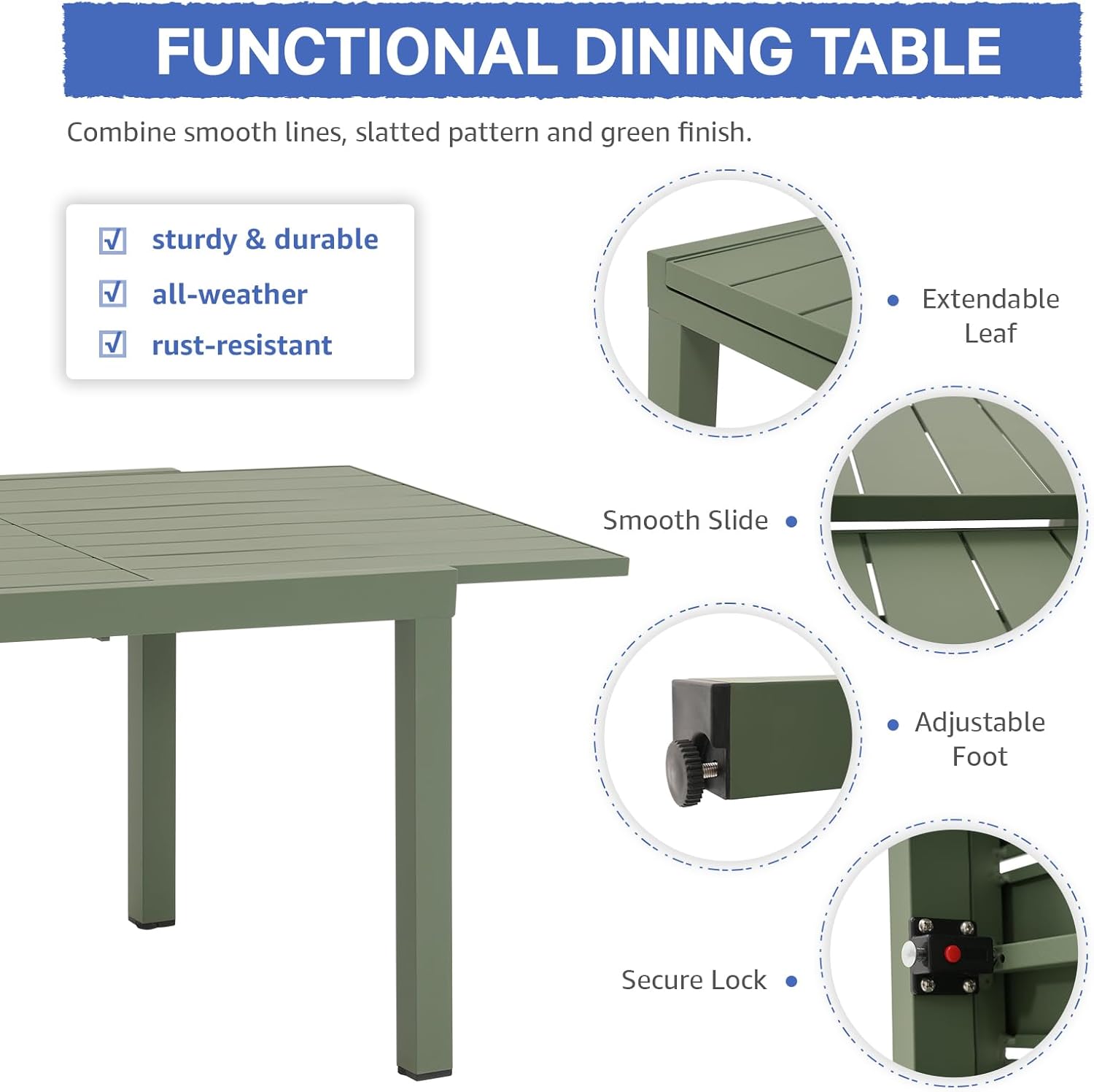 - 【DURABLE FRAME & FUNCTIONAL DETAIL】: Durably made of solid aluminum with a rust- and weather-resistant finish, helping ensure a sturdy rectangular table that lasts for years to come. Also, there are adjustable leveling feet to stay balanced and protect the outside table during movement.