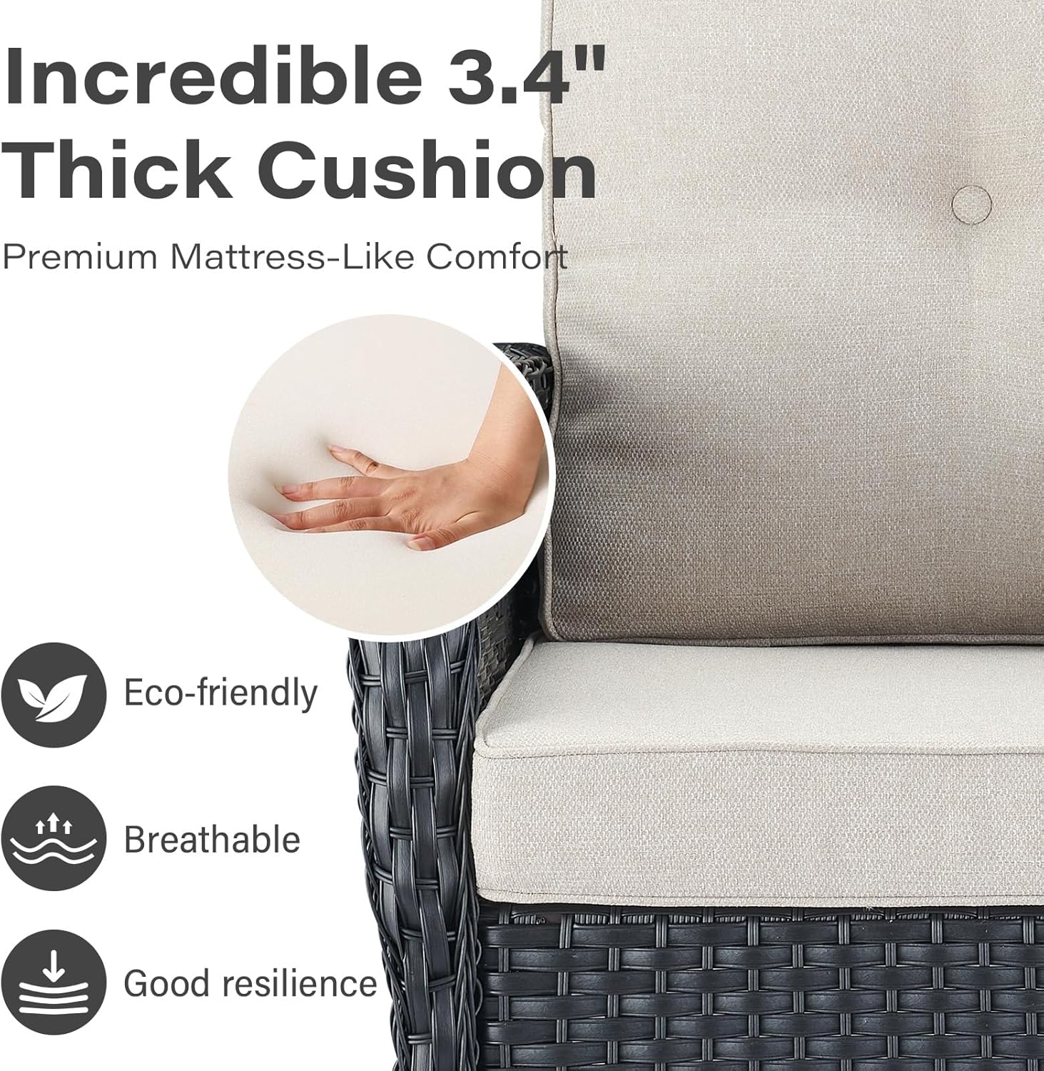 - 4.LUXURIOUS OUTDOOR RETREAT ENSEMBLE: Relax in the beautiful outdoors with this perfect 5 pieces patio furniture set. Our patio swivel rocker chair set with high quality foam cushion, comfortable and soft rebound good. The cushion cover is made of olefin outdoor water-resistant fabric. The seat and backrest are made of beautifully woven wicker coupled with ergonomic design, making it a classic upgrade for any porch, deck or patio.