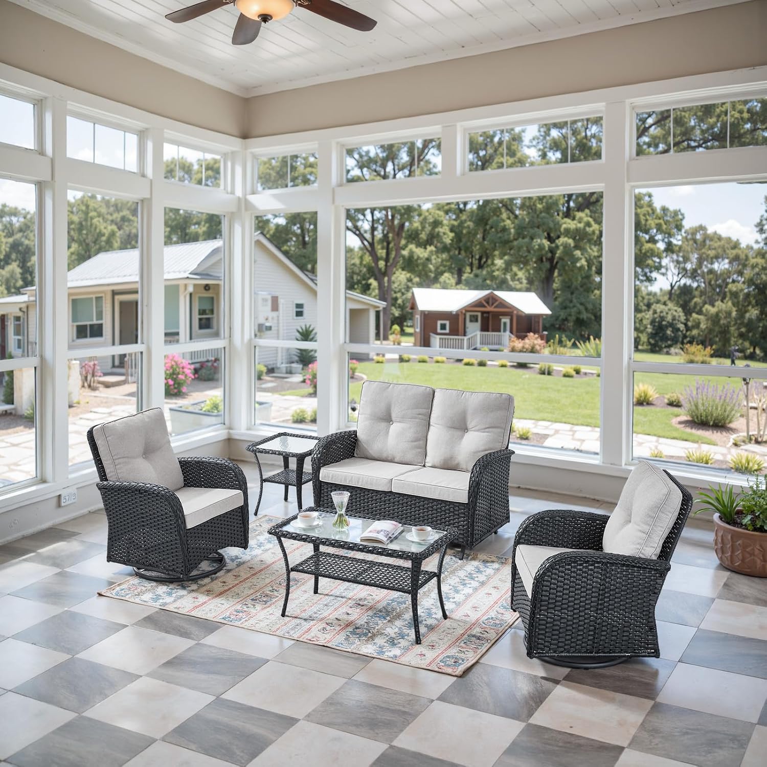 - 1.Patio Furniture Set Details: The 5-piece patio furniture set is the best choice for your patio, backyard or other outdoor space for your chatting needs. This 5 pieces patio furniture set includes a total of 2 swivel rocker chairs, 1 2-seater glider loveseat, 1 glass coffee table and 1 glass side table with removable and washable cushions.