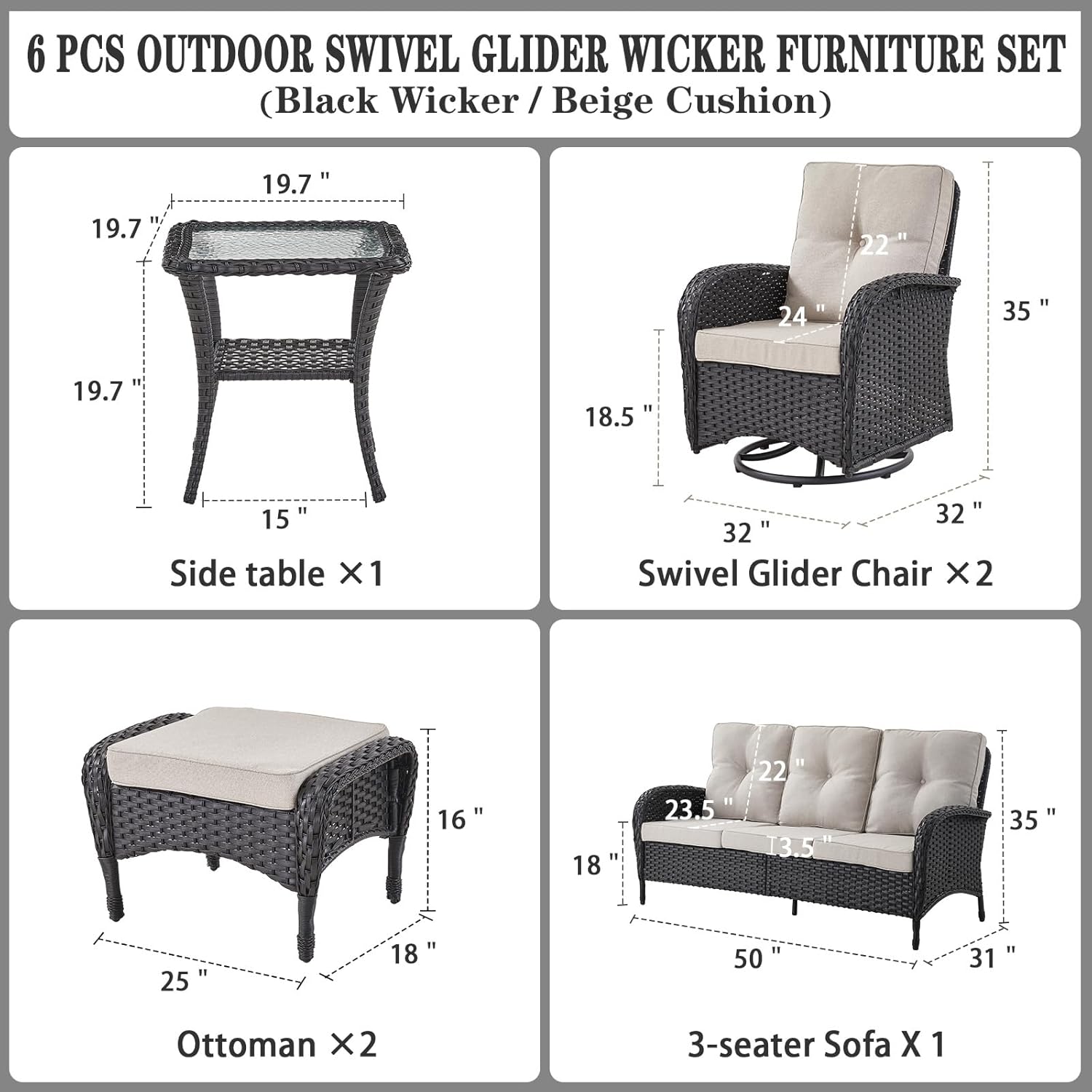 - 4.LUXURIOUS OUTDOOR RETREAT ENSEMBLE: Relax in the beautiful outdoors with this perfect 6 pieces patio glider furniture set. Our patio swivel rocker chair set with high quality foam cushion, comfortable and soft rebound good. The cushion cover is made of olefin outdoor water-resistant fabric. The seat and backrest are made of beautifully woven wicker coupled with ergonomic design, making it a classic upgrade for any porch, deck or patio.