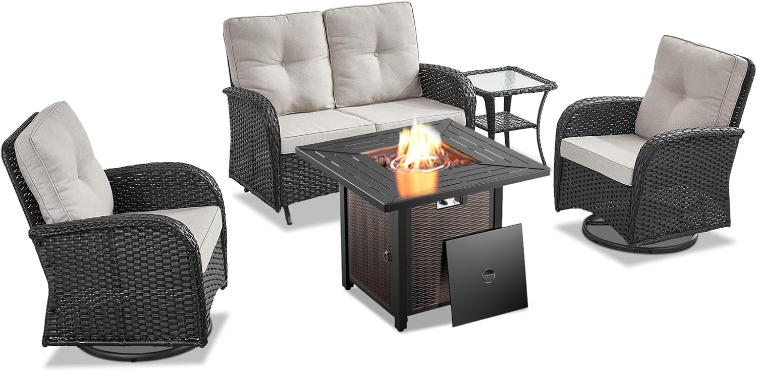 - Belord 5-piece outdoor patio furniture set is the perfect addition to any outdoor space, combining comfort, durability, and functionality. It includes two swivel rocker chairs, a loveseat glider chair, a side table, and a 30-inch propane fire pit table with a powerful 50,000 BTU output, designed to elevate your patio experience. The outdoor furniture set high-quality materials and versatile design make it ideal for outdoor living, whether on your patio, garden, or poolside.
