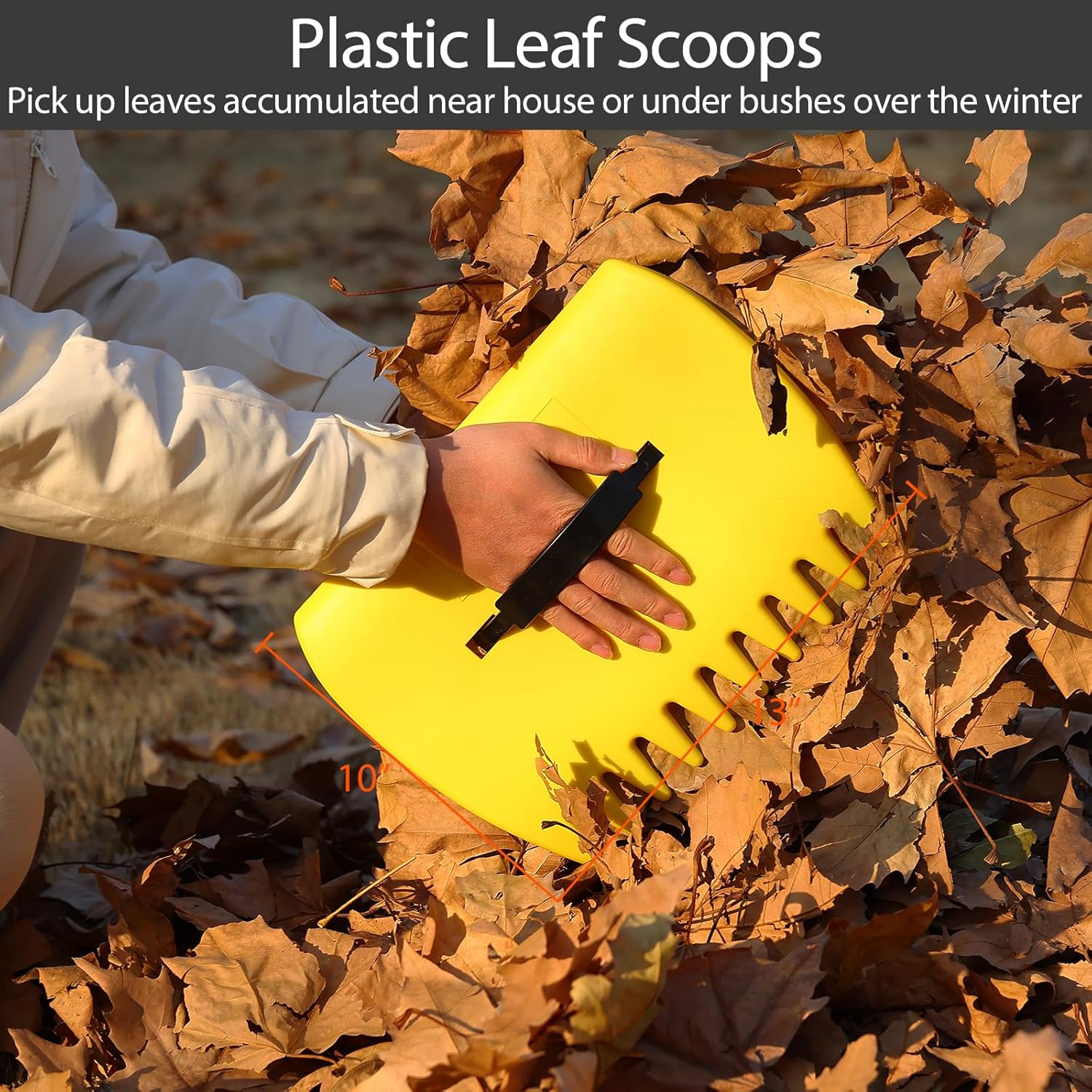 - Leaf collector scoop is useful for picking up leaves which had accumulated near your house and under bushes over the winter months.