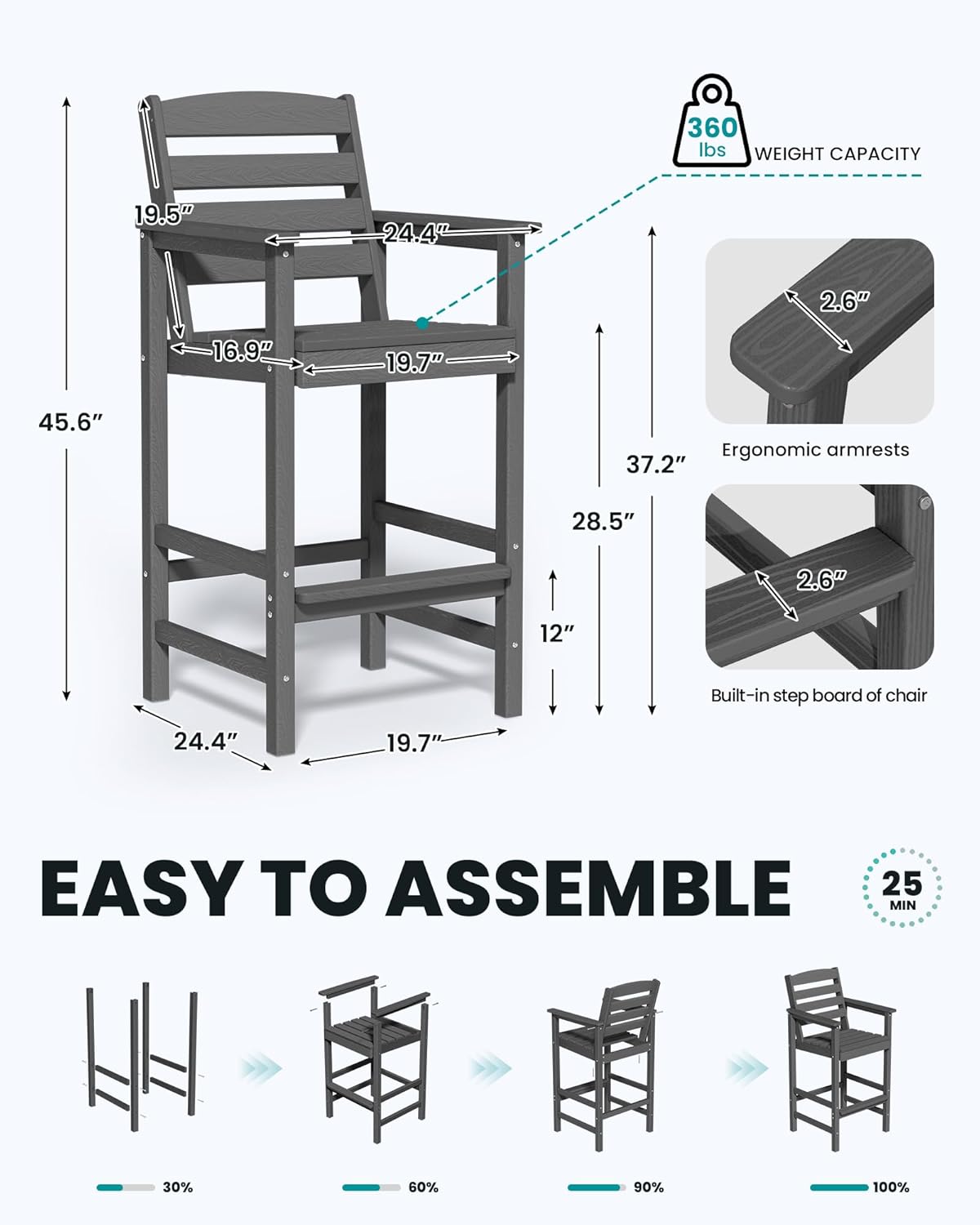 - Easy to Assemble - With clear instructions and necessary hardware provided, every balcony adirondack chair hase 8 parts, only need 5 steps according to the manual included, and you will get a Tall Adirondack Chair (Installation tools included).