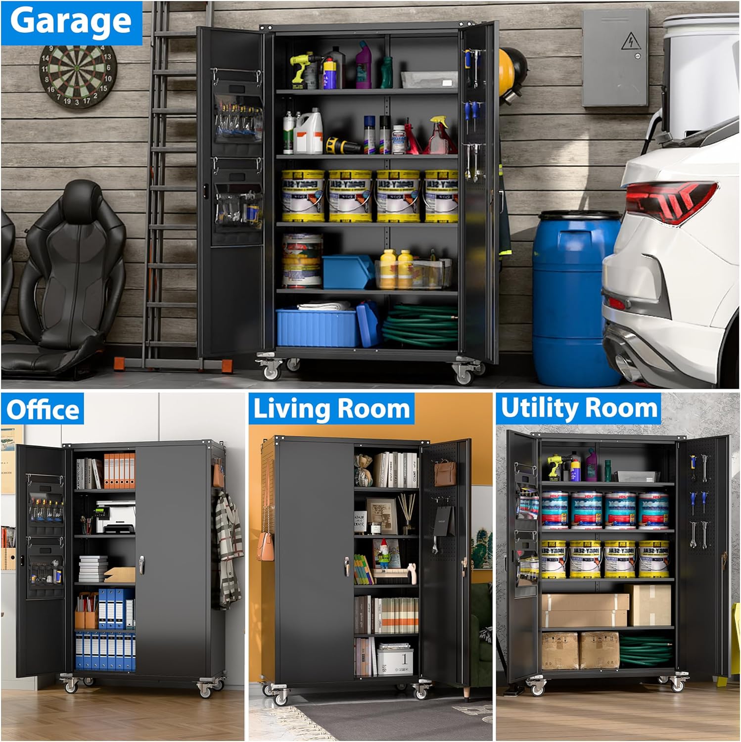 Upgraded Wide & Deep Extra Large Metal Storage Cabinet on Wheels,Lockable Garage Cabinets with 3 Pegboards,2 Tool Pouches for Garage,Office,Assembly Required,Black,43.3''W x 21.6''D x 72''H