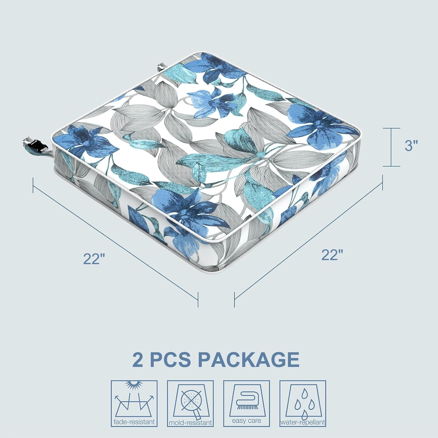- PACKAGING: Includes 2-Pack outdoor chair cushions 22" x 22" x 3", perfect for patio chairs, garden sofas and more. Due to the vacuum compressed status, please allow 48 hours to restore thickness after opening the package