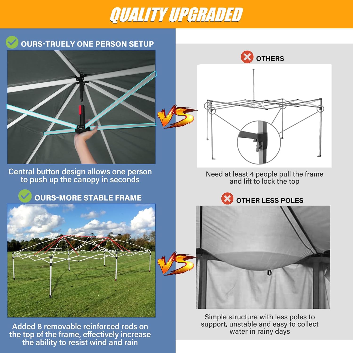- ONE BUTTON EASY SET UP: Our 10x20 pop up canopy tent features patented one-push center lock system. With just a single push, the central hub locks the poles in place. Designed for the new generation, this outdoor canopy tent can be set up in a short time without any tools.