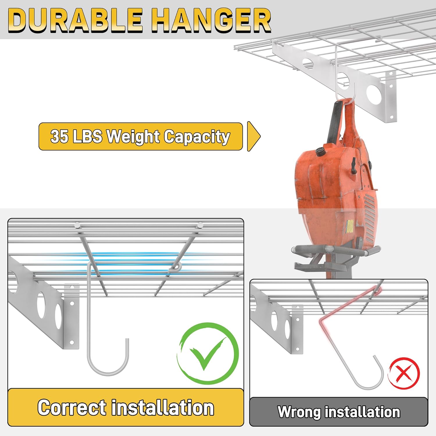 - Versatile Hanging Hooks: This shelf’s 4 metal hooks, each holding up to 40 lbs, offer more than just storage. Hang garden hoses, cords, or tools to keep them within reach and off the floor, helping you maintain balance and order in your garage