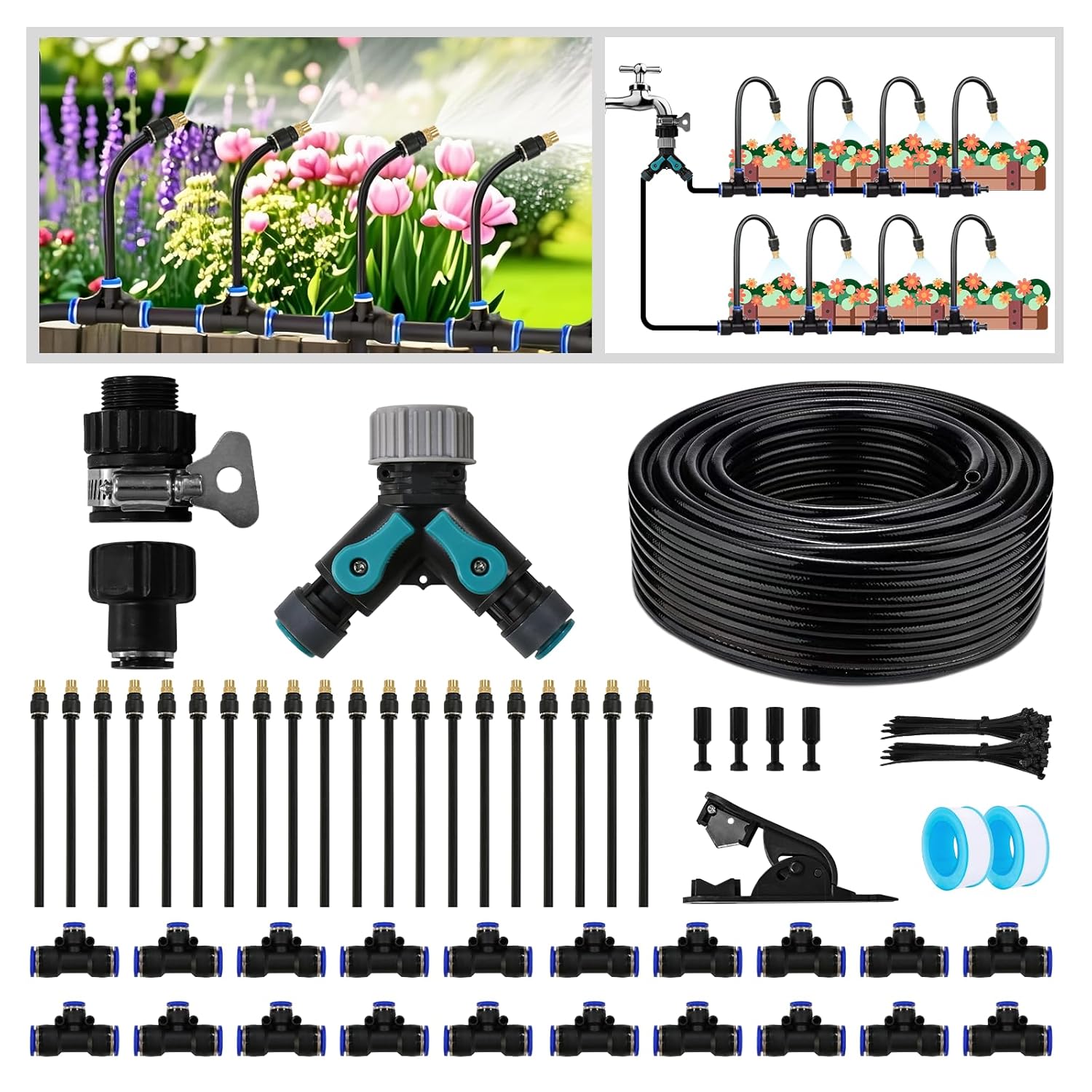 Drip Irrigation Kit - 100 FT. Hose Sprinkler System with 360° nozzles and T-connectors for Gardens, lawns, Plants, Flower beds, Trees, patios and hydroponics (Closeable nozzle-20)