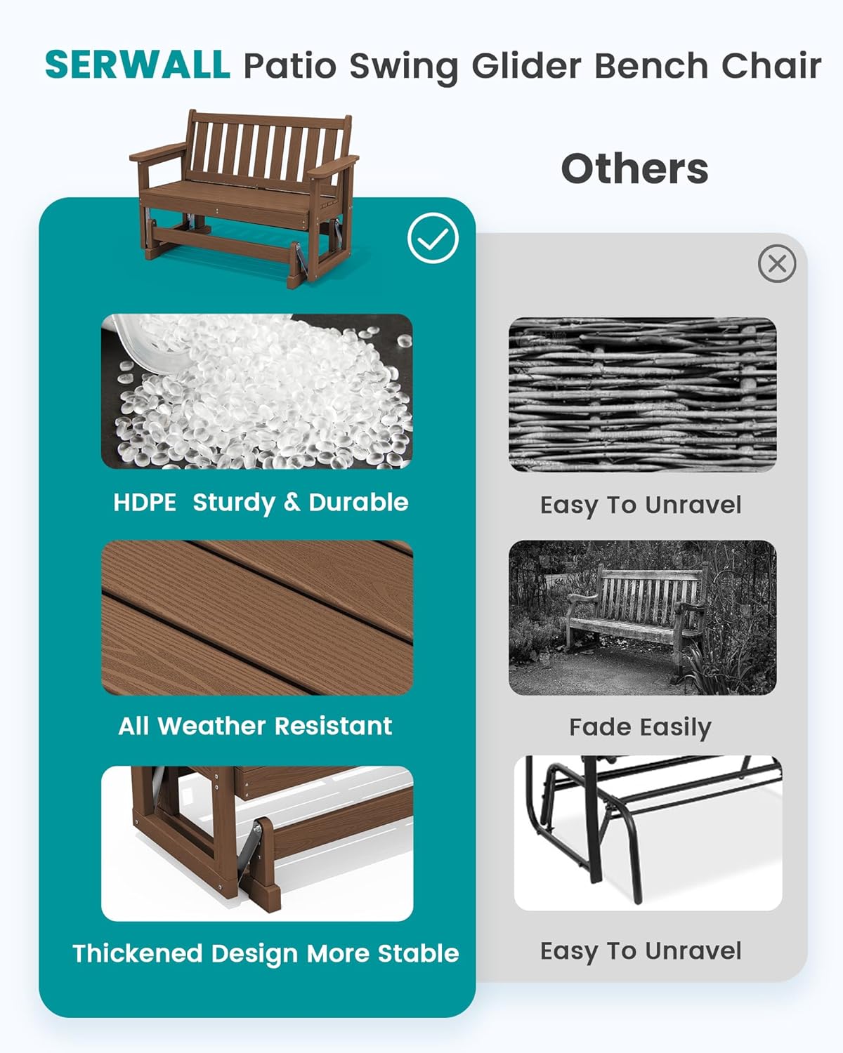- [Outdoor Comfort] SERWALL outdoor swing chairs feature a unique wood-like texture, adding a touch of natural beauty to your space. Enjoy the fresh air and sunshine in comfort with this outdoor glider bench, create your outdoor relaxation paradise.