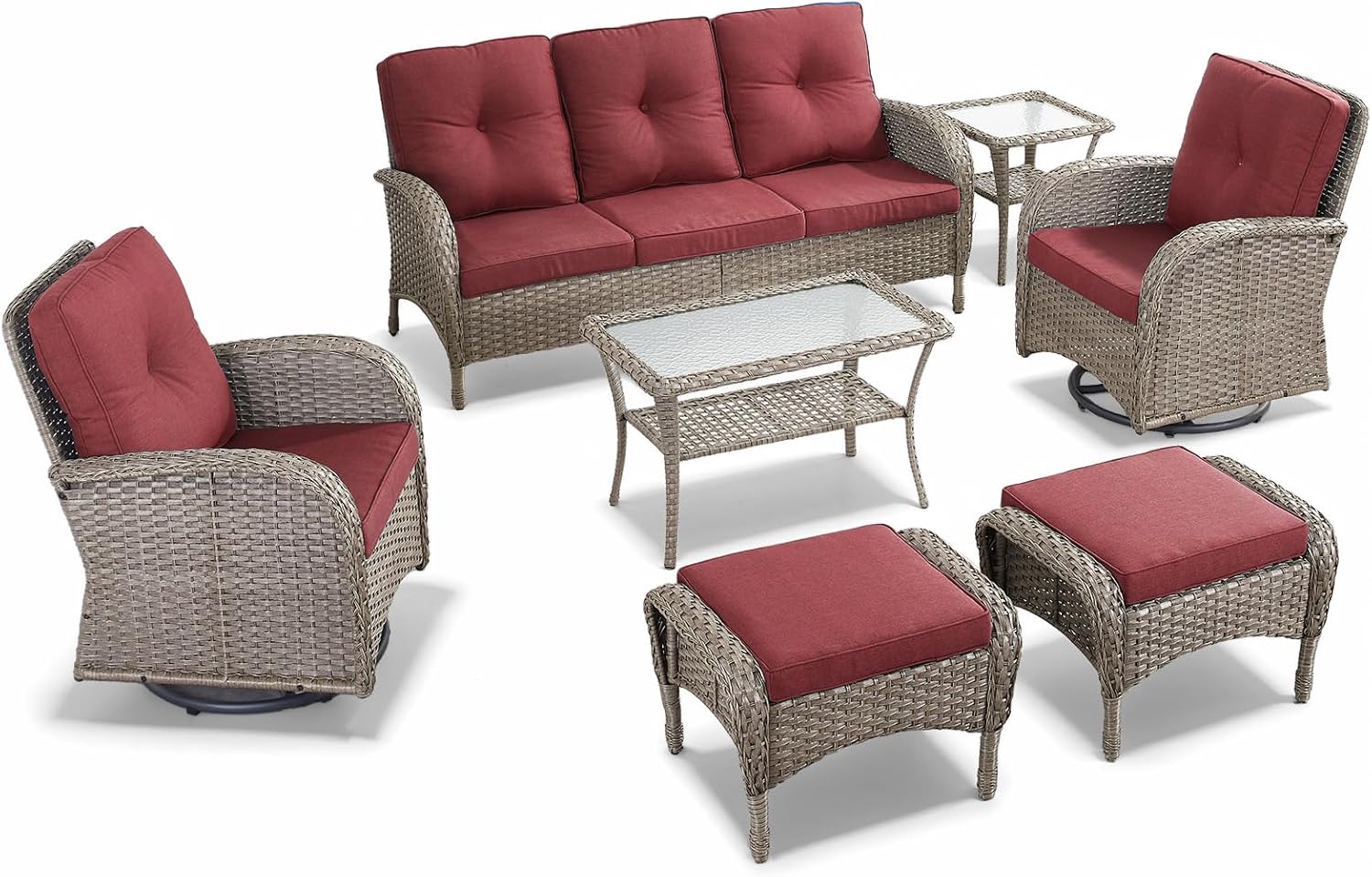 HUMMUH 7 Pieces Outdoor Furniture Set-All Weather Wicker Rattan Couch with Outdoor Rocking Chair Patio Furniture for Deck Lawn Porch Balcony Poolside-Grey/Red