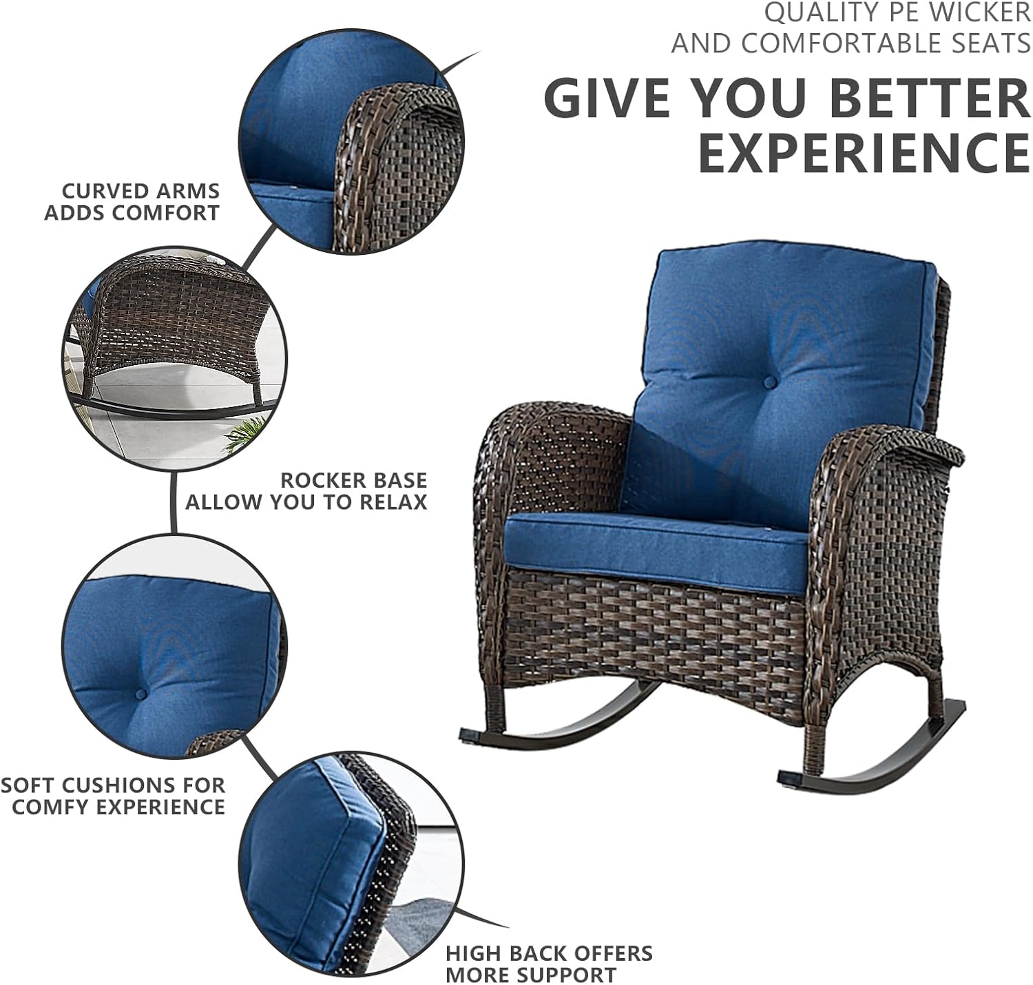 HUMMUH 5 Pieces Wicker Patio Furniture Set,Outdoor Rocker Chairs,Patio Ottomans,Glass Top Side Table,Outdoor Conversation Set for Porch Deck Backyard Poolside