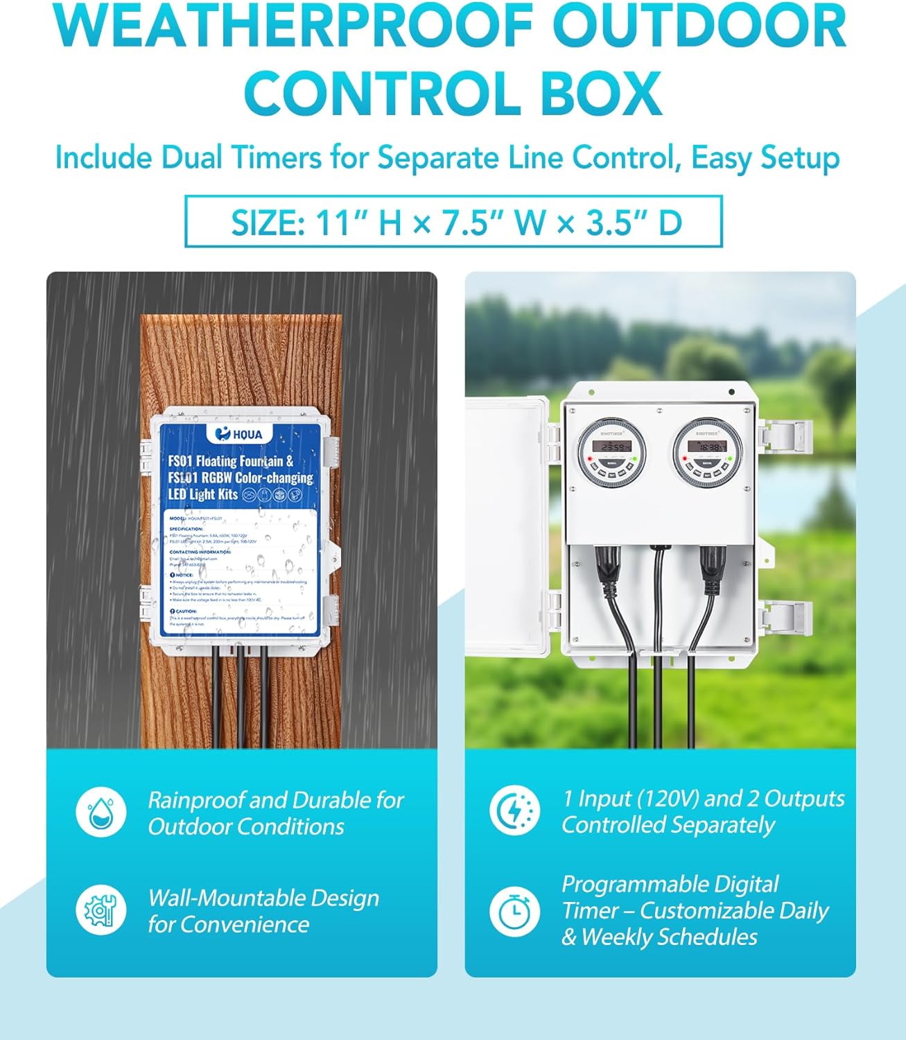 - RGB Color-changing Led light sets included, 4 lights, remote control, 100ft control distance, up to 13 modes. Two digital timers included in the control panel, control the lights and the fountain separately.