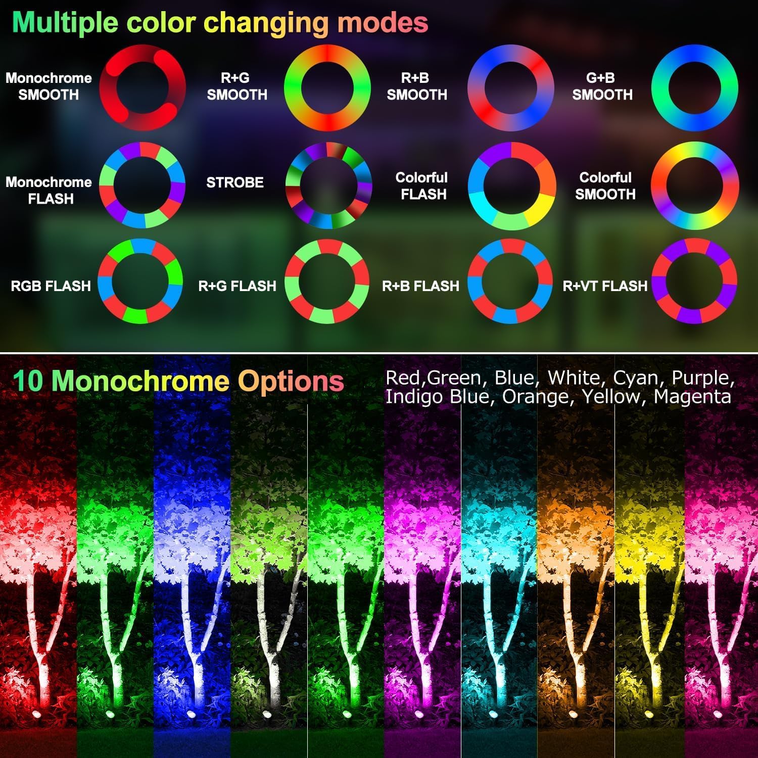 - 10 Colors 12 Modes 2 Brightness: Through the remote control, you can freely convert the rgb solar spot lights into 10 colors, 2 brightness and 12 lighting modes. Solar RGB lights outdoor are available in a variety of colors and brightness modes to suit your needs in different environments