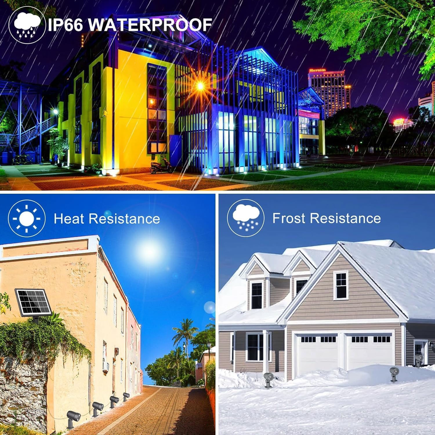 - Sturdy & IP66 Waterproof Garden Solar Light: IP66 waterproof can withstand rainy days, perfect as an outdoor light solar powered. The weatherproof housing keeps the solar rgb landscape spotlights protected from moisture and dust, stable and long-lasting. High temperature resistance and cold resistance -25 °C - 55 °C