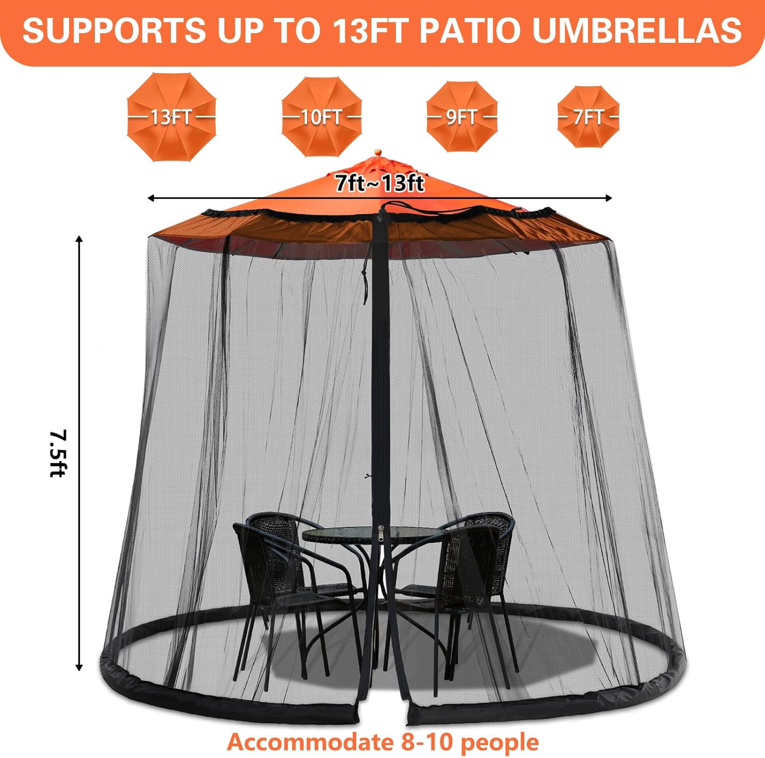 - Product Size:Small bug screen for patio fits 7.5-10FT umbrella, 7.5FT high, large fits 7.5-13FT, 7.5FT high