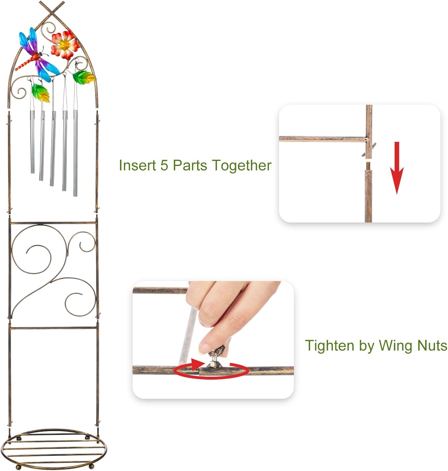 - Elegant Design: This plant pot stand features a charming trellis decorated with vivid colorful dragonfly, flower and leaves for climbing plants and a robust bottom holder for flower pots. Besides, the wind chimes make beautiful sounds when a blows through