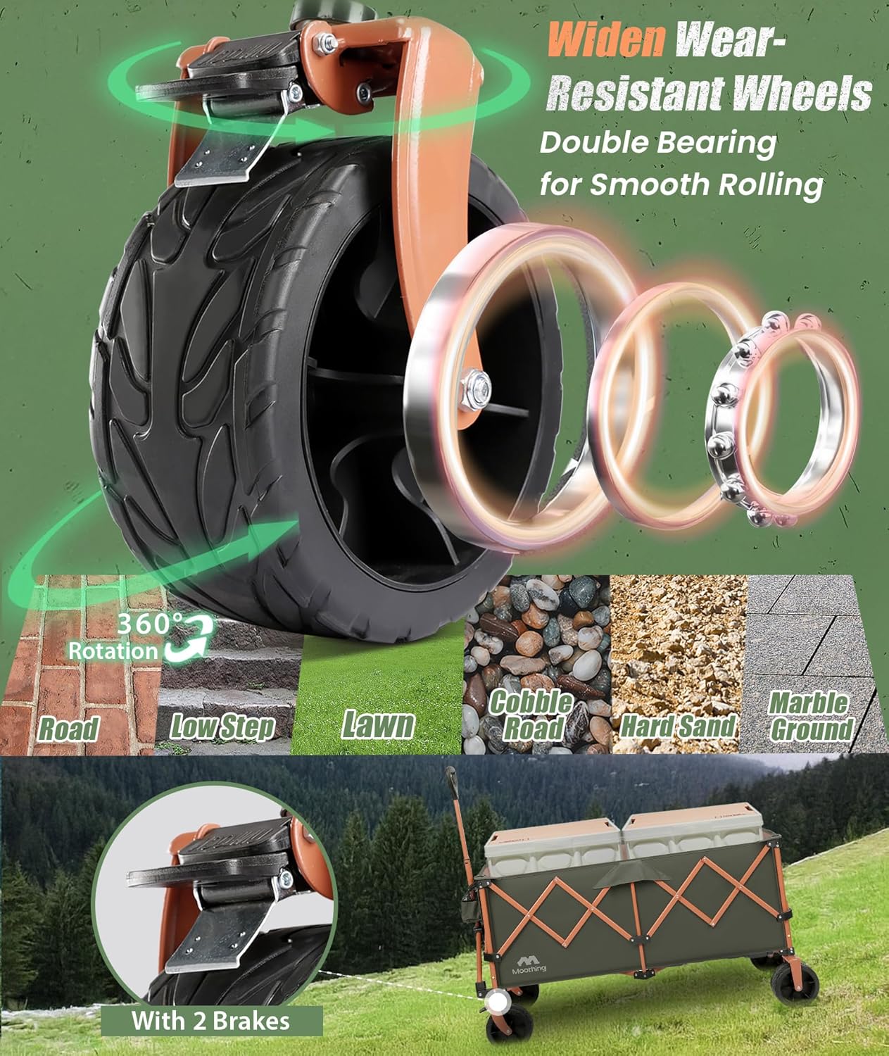 - ๐ณโณ ๐๐ฅ๐ฅโ๐๐๐ซ๐ซ๐๐ข๐ง ๐๐ข๐ ๐๐ก๐๐๐ฅ๐ฌ: Equipped with 360ยฐ big wheels, our utility wagon is designed to handle a variety of terrains with ease. The wheels come with a reliable braking system, providing you with control and safety on uneven or inclined surfaces. Whether you're navigating through your garden, beach, or a construction site, the wheels of our grocery wagons ensure a smooth ride under control