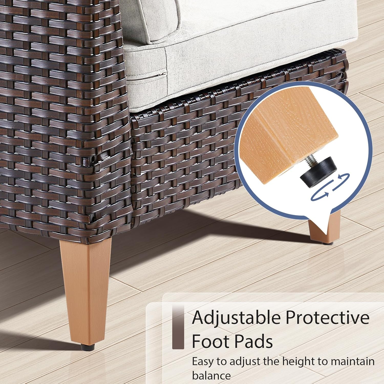 - Durable Sturdy Construction:All made with anti-rust powder-coated metal frame and high-quality Handwoven PE wicker which makes this patio furniture set resistant to UV and all weather,The upgrated trapezoidal feet provides strong support,with the non-slip plug, it will help you to avoid scratches on the floor when you move the furniture around.