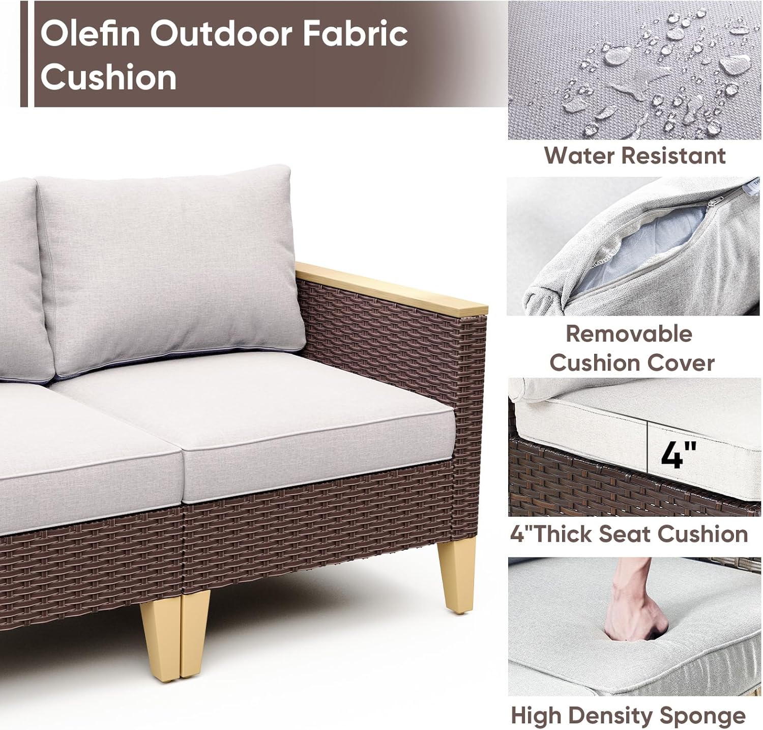 - Comfort Thick Cushions:Our cushions are made of high-quality olefin fabrics that provide excellent UV protection and water repellent function,Filled with a high-density 4" sponge to stay fluffy and non-deformation,Provide soft and comfortable seating experience, removable cover design is easy to clean.