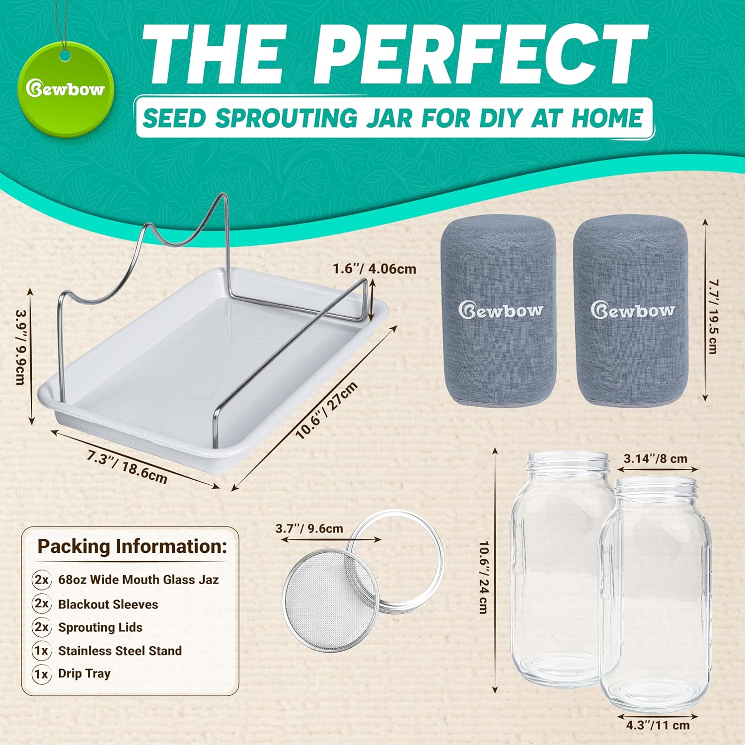 - [ 2000 ml Large Capacity Mason Jars ] Each kit comes with two extra-large 2000 ml Mason jars, twice the size of typical sprouting containers. These spacious jars provide ample room for your sprouts to grow, allowing you to cultivate enough for your entire household in a single batch, maximizing both your time and effort.