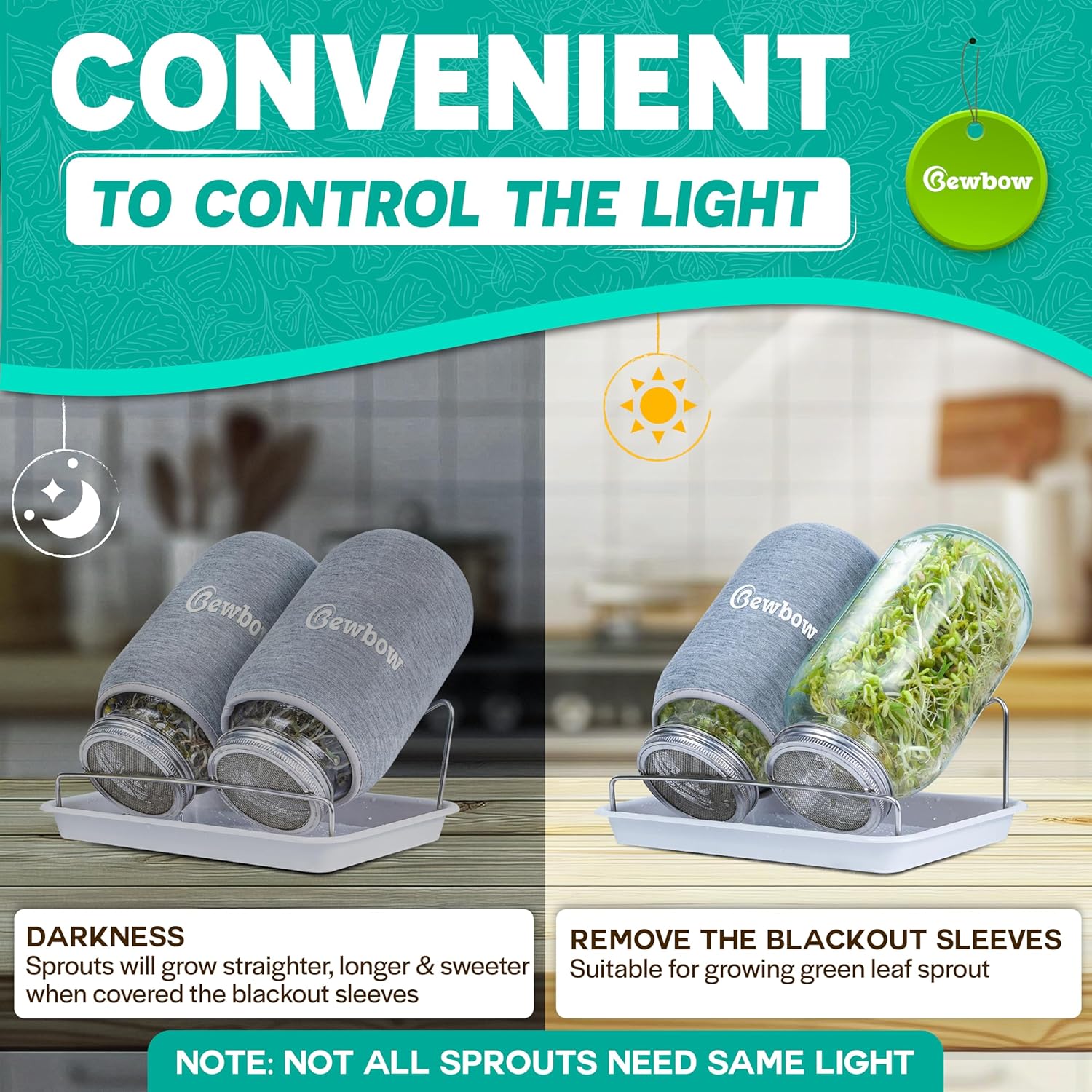 - [ Convenient & Easy to Use ] No soil or chemicals are required. Simply place your seeds in the jar, soak them in water at 40-50°C for 4-8 hours, then drain and position the jars on the stand. The blackout sleeves help regulate light exposure, encouraging the growth of straighter, sweeter, and longer sprouts. For best results, watering the seeds 2-3 times a day. Once sprouting begins, remove the sleeves to promote green leaf development.