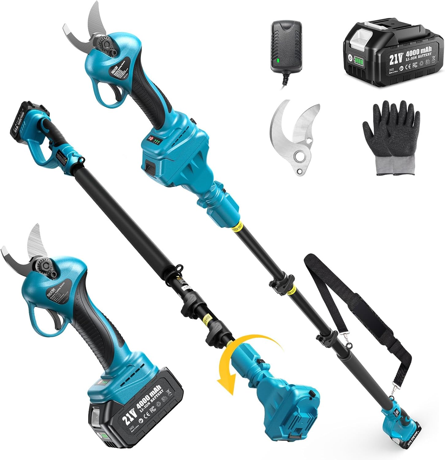 Seesii 2-in-1 Electric Pruning Shears with Pole, 15Ft Reach, 1.2" Cutting Diameter, 21V 4000mAh Battery, Cordless Pruner with Brushless Motor for Orchard, Flower, Branch, Tree Trimming