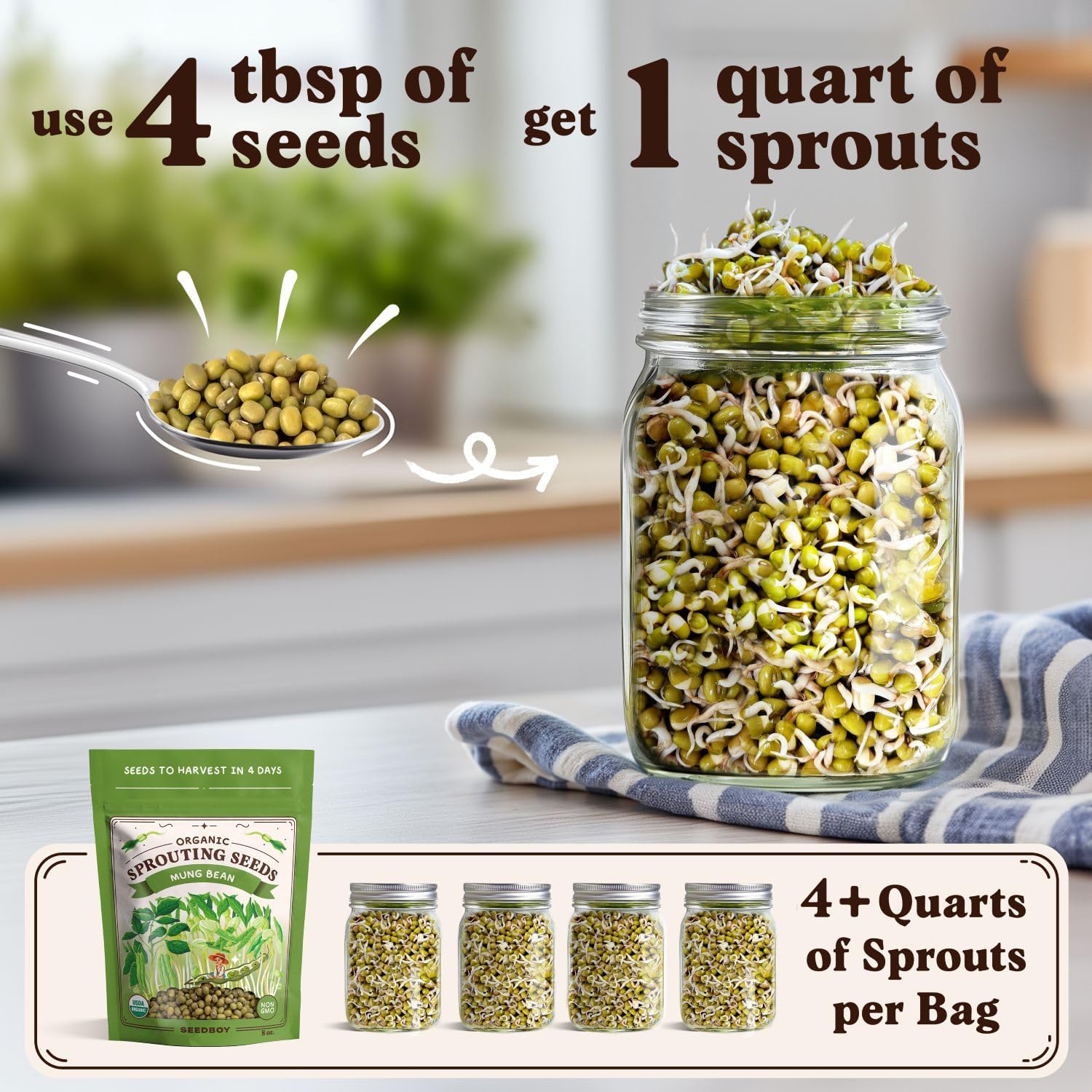 Seedboy Organic Mung Bean Seeds for Sprouting - Non-GMO, USDA Organic Sprouting Seeds Mix - Makes 5 Quarts of Sprouts, 15 Servings (8 oz) (Mung Bean)