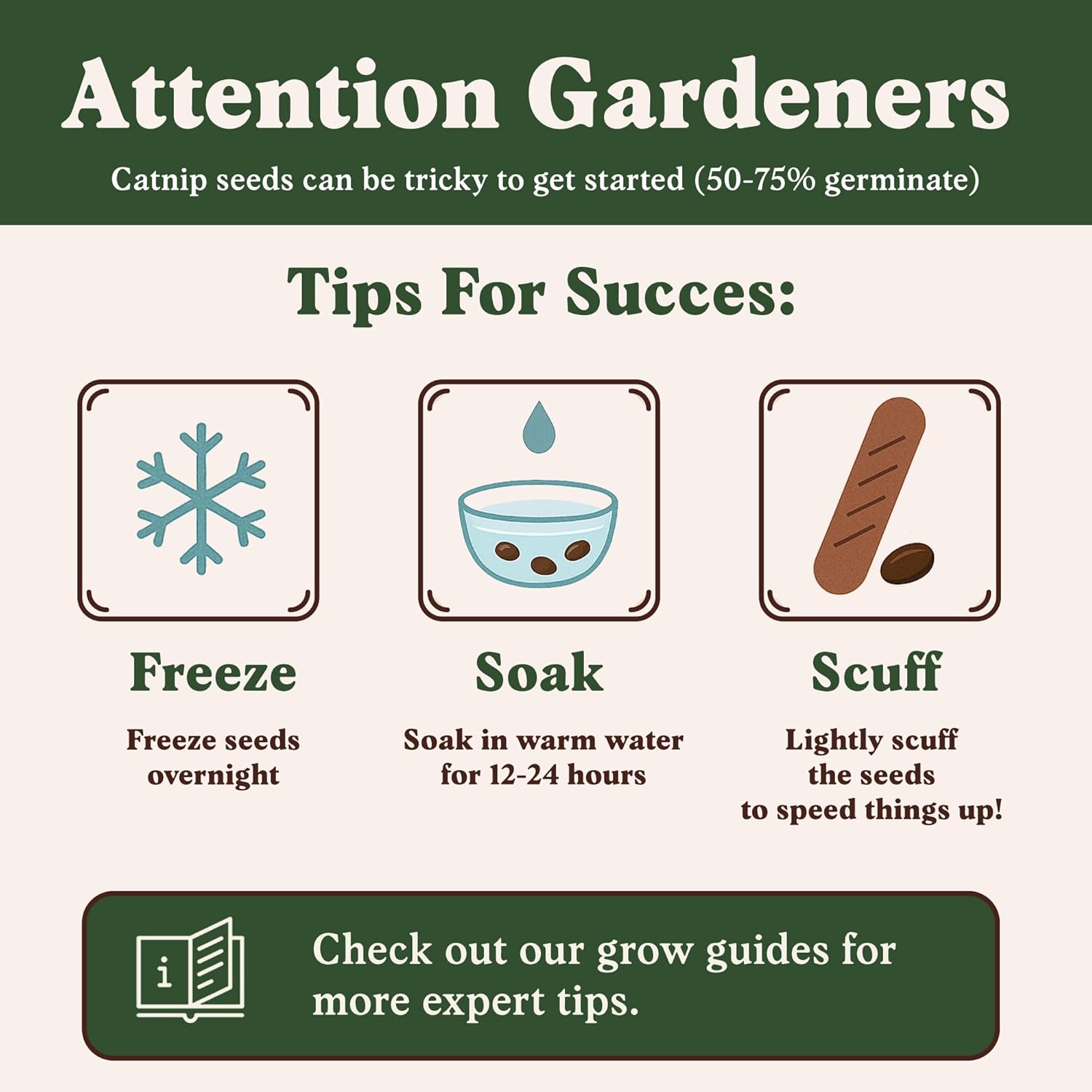 - Attention Gardeners! - Catnip seeds can be finicky (50-75% germination). Boost success by freezing overnight, then soaking in warm water for 12-24 hours. Lightly scuffing the seeds can speed things up! Check out our downloadable grow guides for more expert tips.