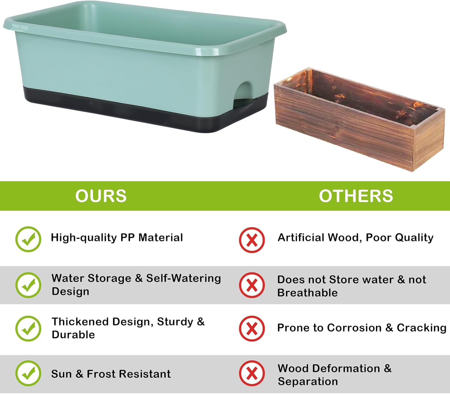 - 【Premium & Durable】The planter pots are made of high quality PP material and has been thickened to bear up to 300KG (660LB). This window box planter is sturdy, wear-resistant and durable. It can be exposed to light, wind, and sunlight for long periods of time, with a lifespan of decades. It is an excellent planter box for both indoor and outdoor.