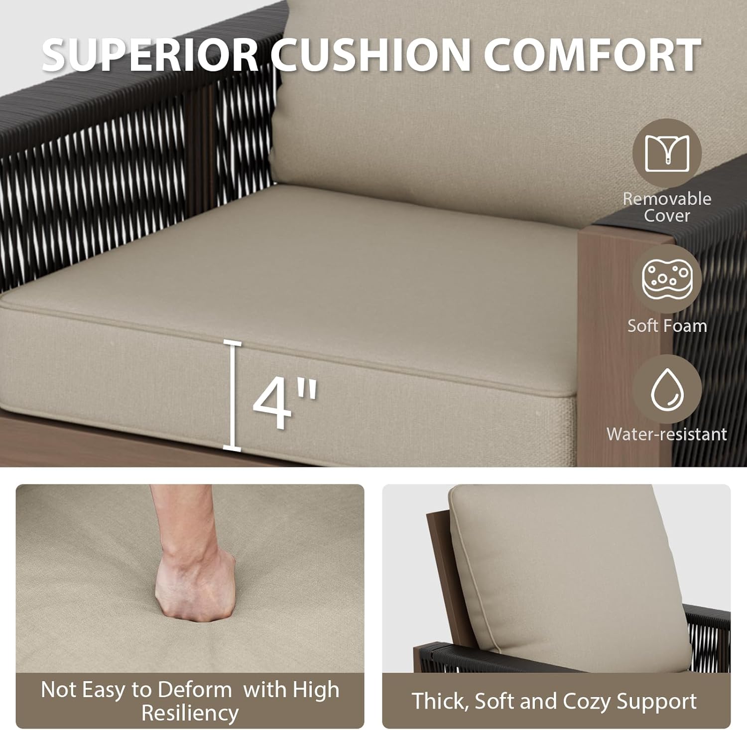 - SUPERIOR CUSHION COMFORT: Generously padded with soft foam and wrapped in premium UV resistant Olefin fabric, the cushions provide a cozy, supportive feel for hours of relaxation. The covers are equipped with a convenient zipper closure for easy removal, making cleaning and maintenance a breeze.