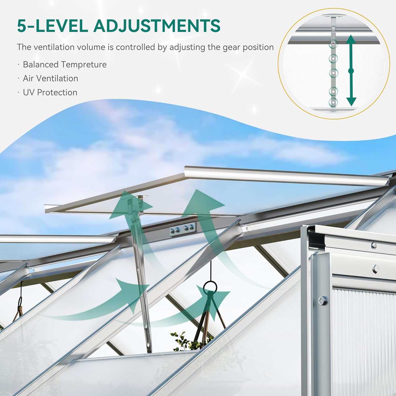 - ALL SEASON GREENHOUSE: Top tilt angle design of the polycarbonate aluminum greenhouse helps to achieve effective wind resistance and drainage capacity; This beautiful and convenient product is ideal for gardens, decks, and backyards for year-round plant cultivation and protection