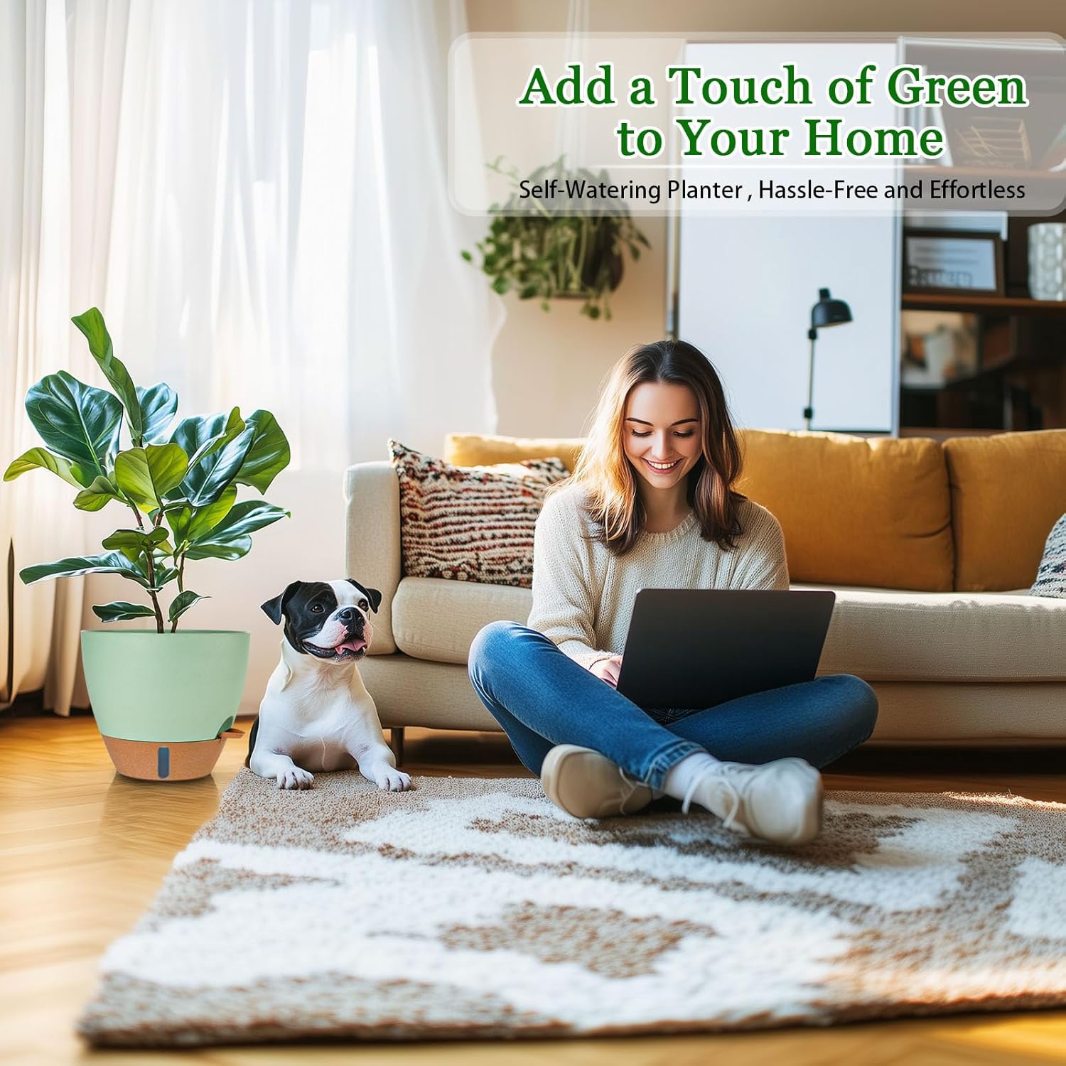 2 Pack 10 inch Plant Pots, Plastic Self Watering Planters with Drainage Holes, Deep Reservoir, Water Level Indicator, Modern Decorative Flower Pots for Indoor Outdoor Plants (Green, 10 inch)